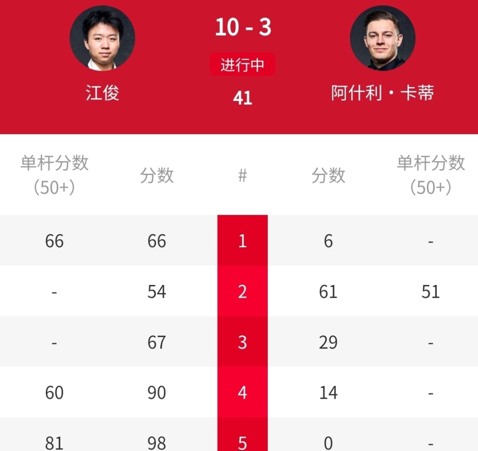 与此同时,江俊、王信伯、姚朋成、高阳在第二轮的表现则是极为出色。江俊以10-3战胜阿什利-卡蒂,王信伯以10-5战胜尤里安-博伊科、姚朋成以10-5战胜大卫-利利、高阳以10-6战胜马克-戴维斯。祝贺他们!