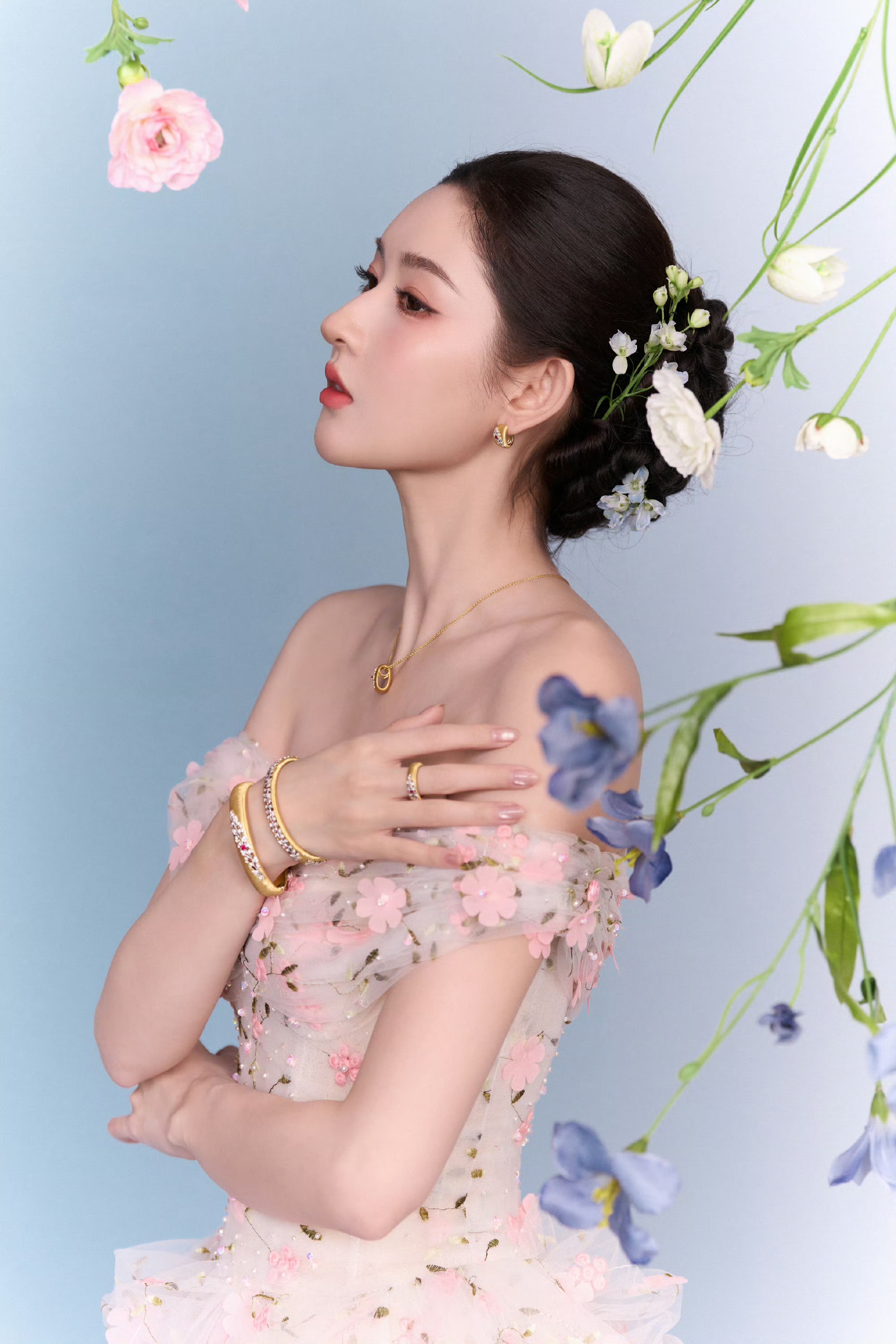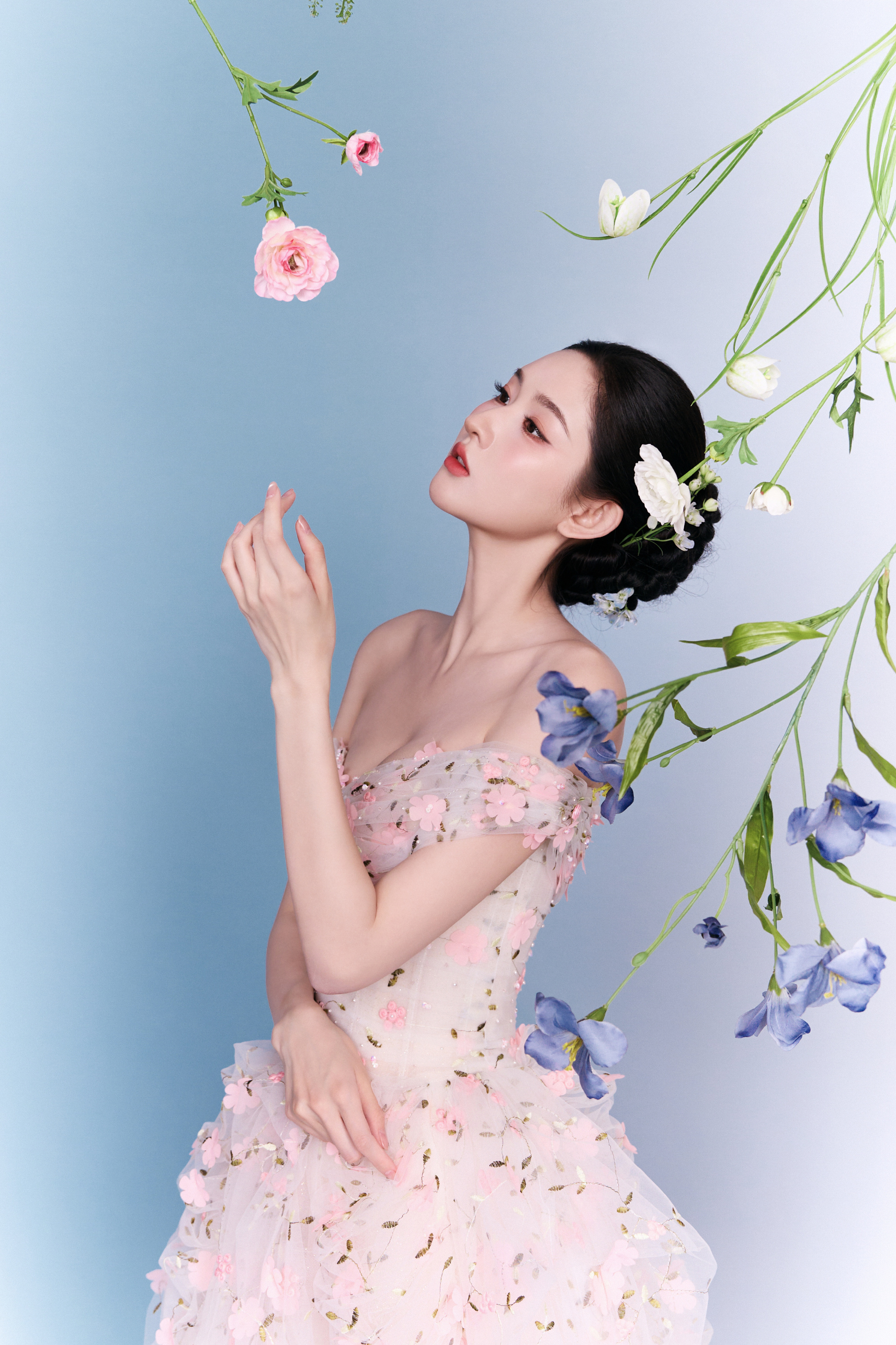 王玉雯粉红抹胸连衣裙春日造型,"花仙公主"美神降临