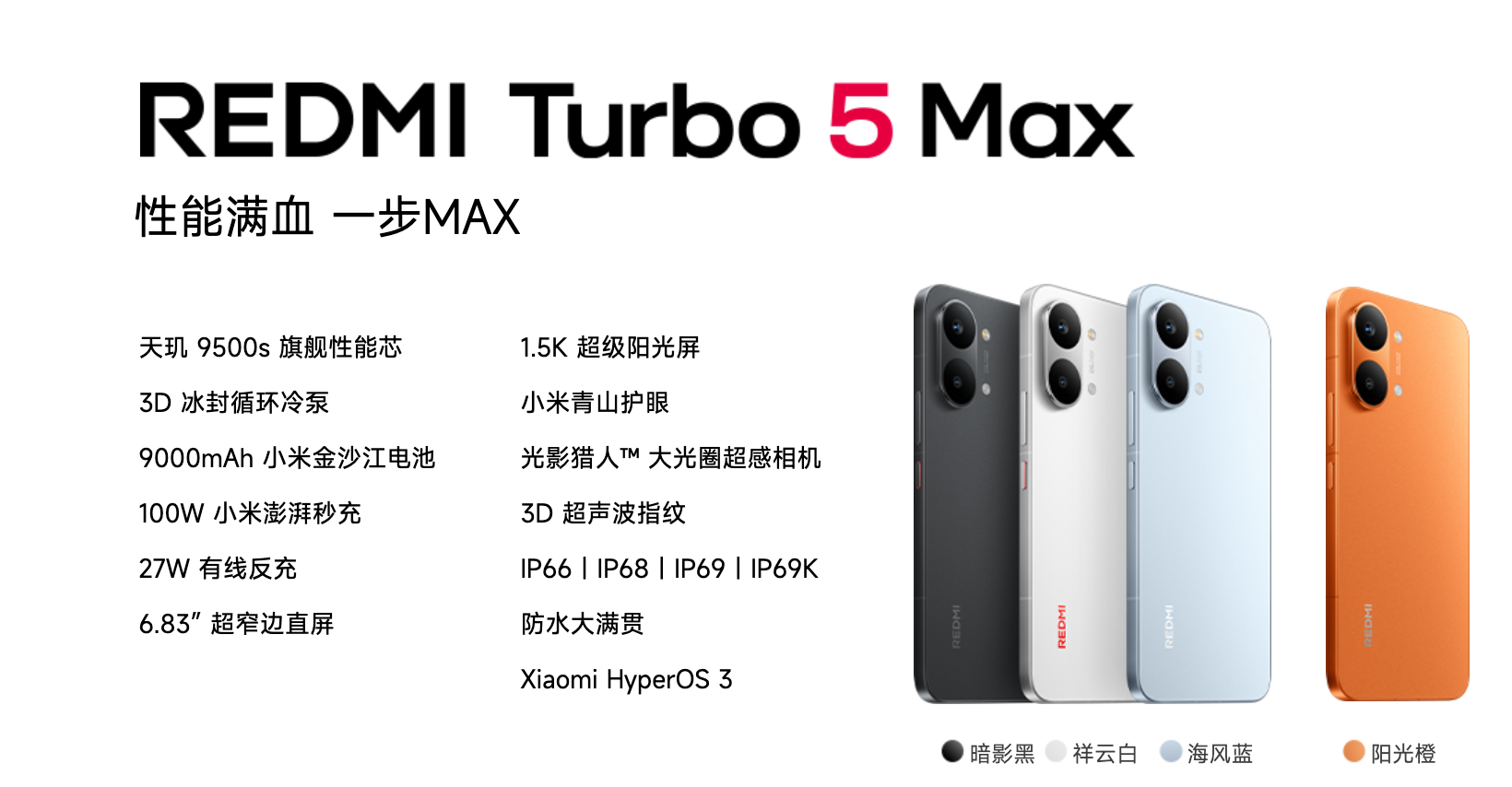 闭眼选红米Turbo 5Max另外,K15Pro+的天玑9500s机型正好有一个竞品,那就是红米Turbo 5Max,这款手机也是9500s处理器,并且还是9000毫安大电池,再加上6.83英寸的M10基材1.5K屏,一样有3D指纹解锁,还有1115F双扬,也是100W快充带充电头版本,目前小米还没有调价,我们看看它的价格: