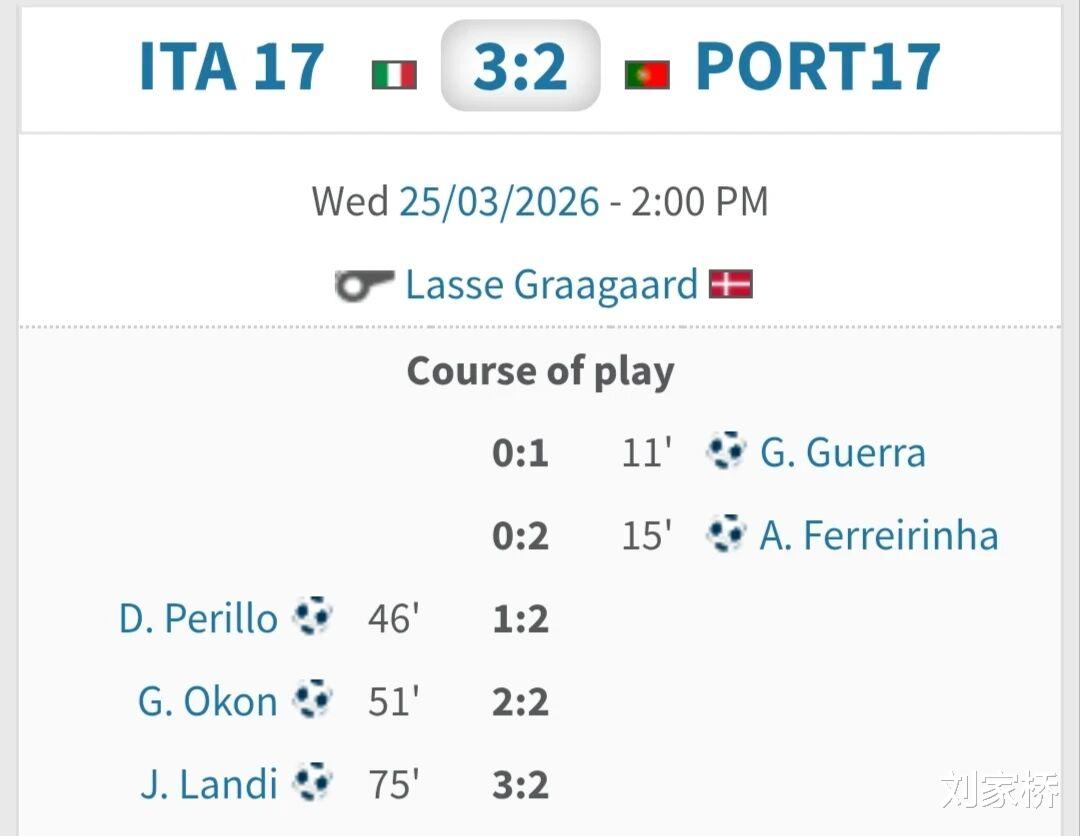 此役,葡萄牙U17开场早早就进入状态,格拉和费雷里尼亚的进球帮助他们在比赛进行到第15分钟时就取得2-0领先。可下半场比赛开始后,意大利U17逐渐掌握场上主动,佩里洛、奥孔和替补出场的兰迪接连破门,为意大利U17最终逆转获胜立下大功。
