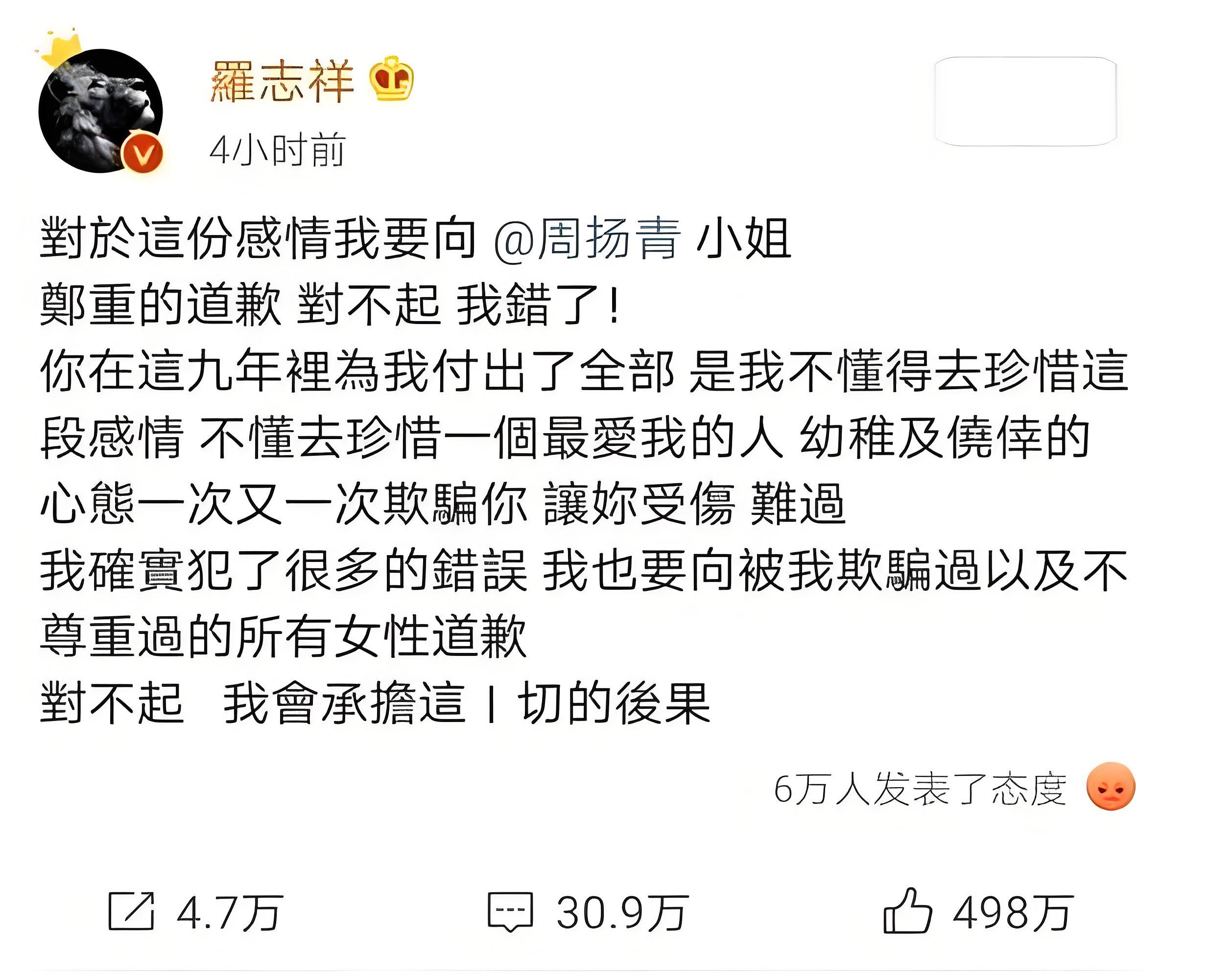 出轨事件成为事业崩塌的导火索,丑闻直接导致罗志祥的内地代言全面解约、综艺节目除名,商业损失超3.6亿新台币。