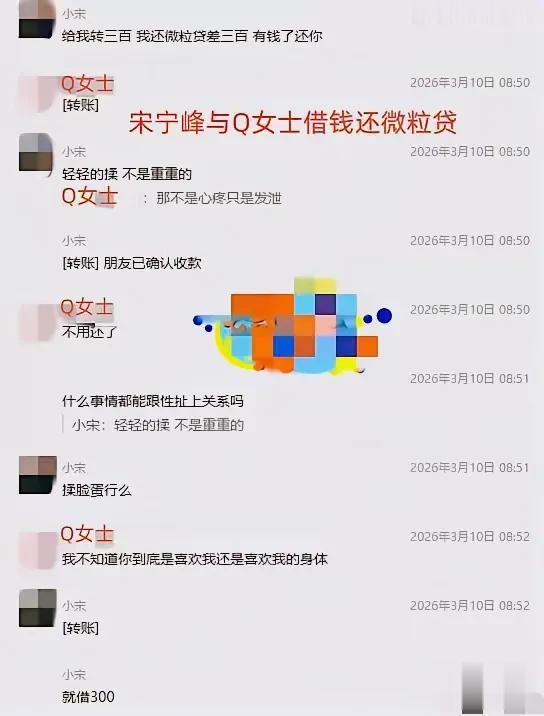 Q女士声称交往一年,没有花过宋宁峰一分钱,张婉婷那些“交往一年花费宋宁峰几十万”的言论都是无中生有,借题发挥。后面张婉婷在检查宋宁峰的转账记录后也只是找出了一条三百元的信息,还是宋宁峰跟Q女士借的,并表示“有钱了会还”,张婉婷你这看钱看得也太严了吧?目前张婉婷也确实没有实证证明宋宁峰为Q女士高额花费的依据,所以宋宁峰可能真的在这段关系中没啥物质损失。