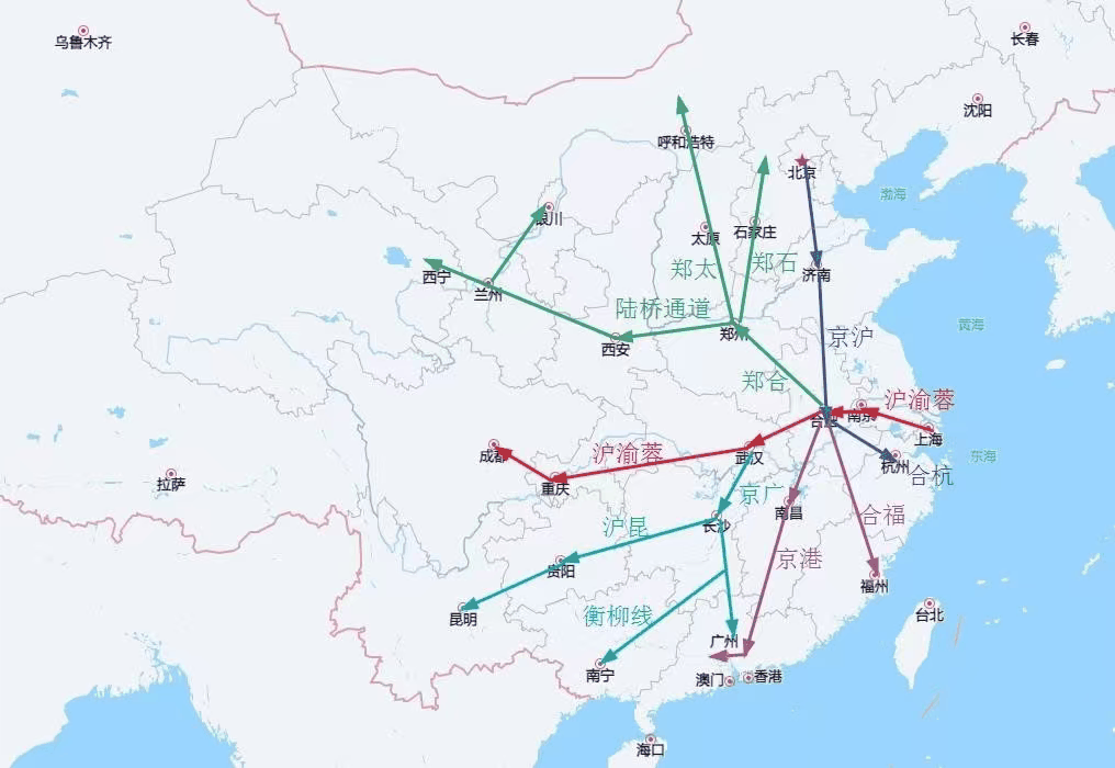 京港(台)通道:原计划走湖北黄冈,经合肥积极争取,改线建设商合杭高铁(商丘至合肥)与合安九高铁,使合肥成为南北大动脉的关键节点 。