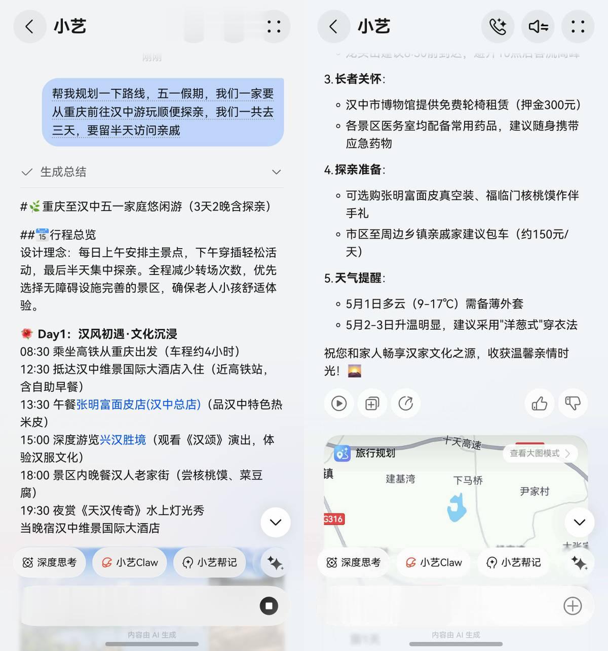跟很多长辈一样,我妈也是人老但不服老的类型,有时候带她出去旅游或者探亲访友,她也会自告奋勇帮着参谋路线。用上畅享90 Pro Max之后,她完全把这个工作交给了小艺:“帮我规划一下路线,五一假期,我们一家要从重庆前往汉中游玩顺便探亲,我们一共去三天,要留半天访问亲戚。”很快,小艺就给出了行程规划,并且还给到了探亲准备、长者关怀、天气提醒等建议。
