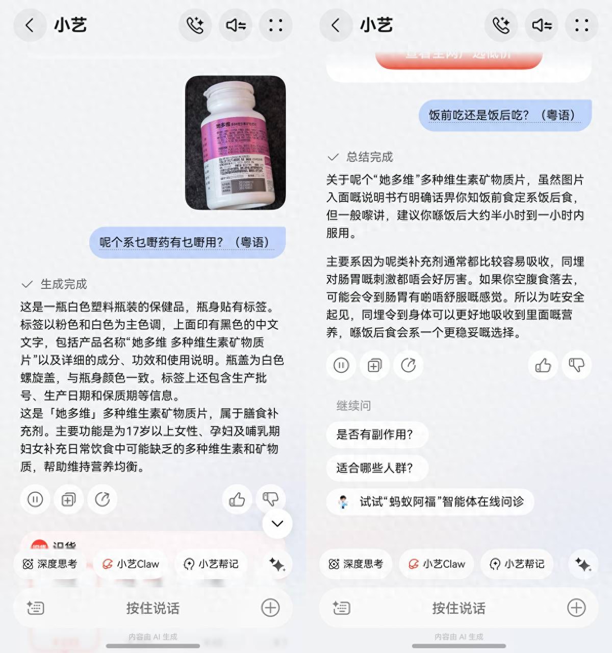 现在我妈每次吃新药之前,都会习惯性地让小艺把把关。拍张药盒的照片,对着小艺说句话,药品信息就出来了。有时候她还会问小艺一些家常菜的做法,小艺也会用方言全程回应她。