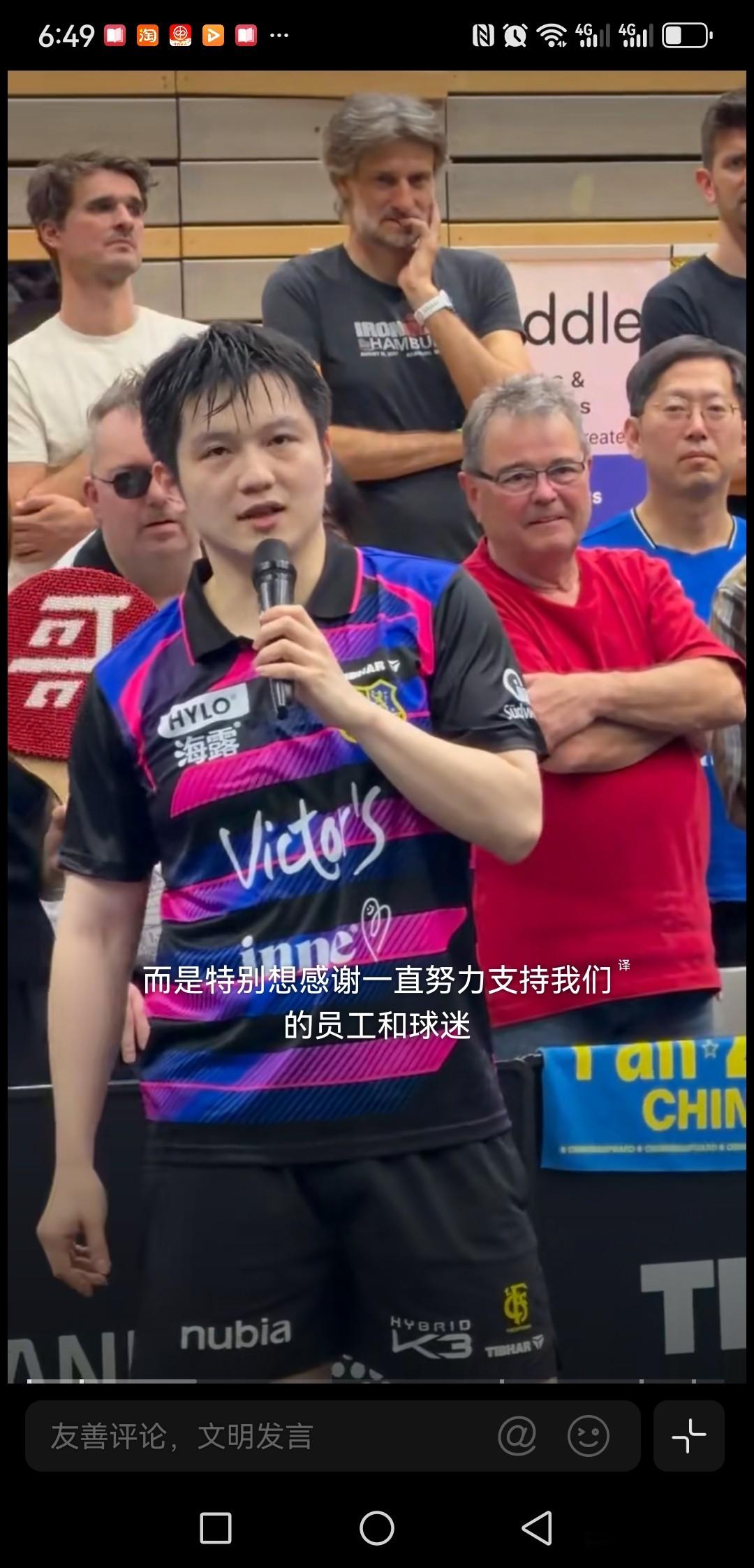 这是樊振东在萨尔布吕肯俱乐部的最后一场球,虽是逆转但也算完美收官。比赛结束球队为他举办了告别仪式,现场球迷热情不减齐唱《朋友》。