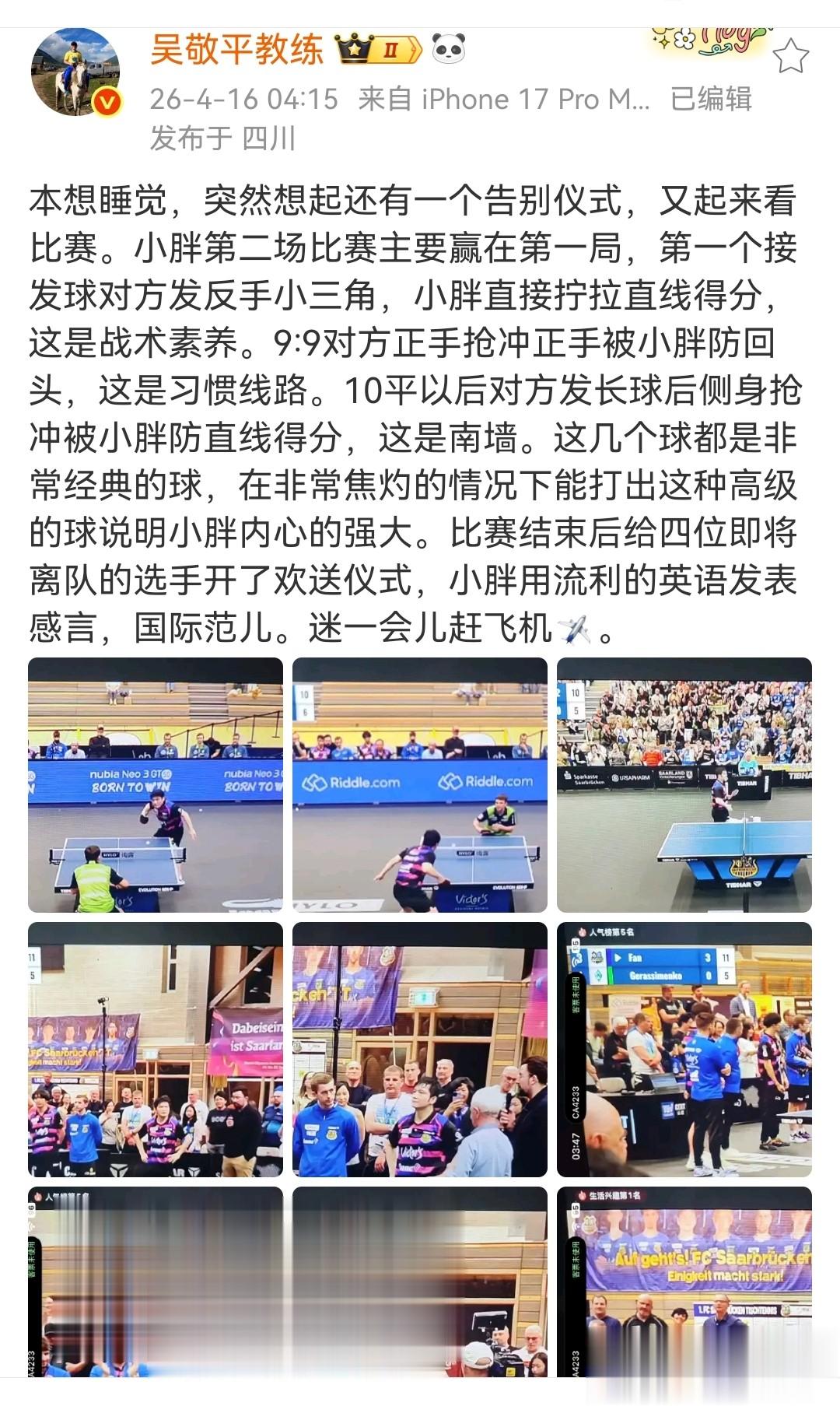 远在国内的恩师吴敬平始终牵挂弟子,即便深夜依旧全程关注赛事。