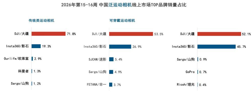 这股强劲势头,也体现在泛运动相机领域。根据洛图科技发布的《中国运动相机线上零售市场周度追踪》报告,2026年第15-16周(2026.04.06-2026.04.19)最新双周,大疆在该领域以66.2%的合计销量份额位居第一,展现了无可争议的领导地位。