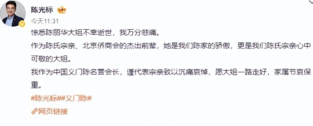 陈丽华去世后,陈光标在社交平台发动态,称她是自己的陈氏宗亲,十分沉痛,可明眼人都知道,陈丽华是满族,和汉族陈氏毫无关系,根本不是宗亲。