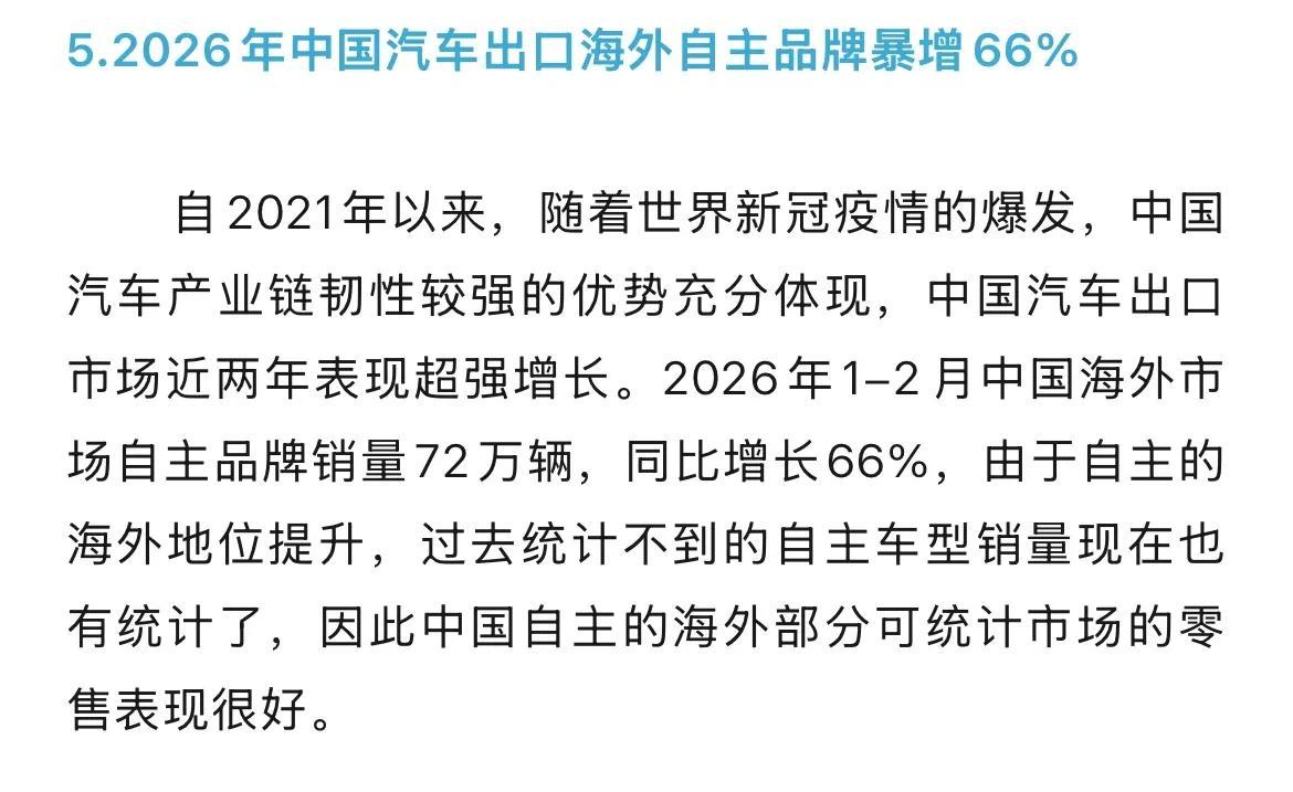 今年1-2月份,自主品牌海外销量高达72万辆,同比增长66%。