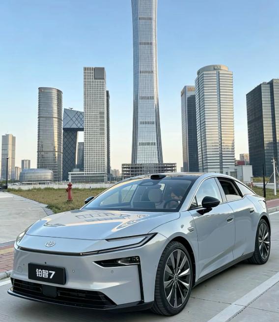 铂智7定位纯电豪华轿车,车身尺寸达到5130mm、1965mm、1491mm(部分版本高为1506mm),轴距长达3020mm,是标准的中大型轿车身段,停在路边自带豪华气场。新车整体设计没有夸张浮夸的线条,符合大众审美。封闭式前脸搭配犀利的大灯组,兼顾纯电车的科技感与丰田家族式的稳重感;20英寸标配轮毂让侧面比例更协调,气场十足;加上那个大溜背和长三角窗,侧面线条非常优雅,有点像那种行 政 级的游 艇。尾部造型宽厚稳重,简约的尾灯设计可提升辨识度。日常家用低调沉稳不张扬、不突兀,商务接待、走亲访友也足够体面,即便开上多年也不会过时,比较符合家庭用户长期用车的需求。