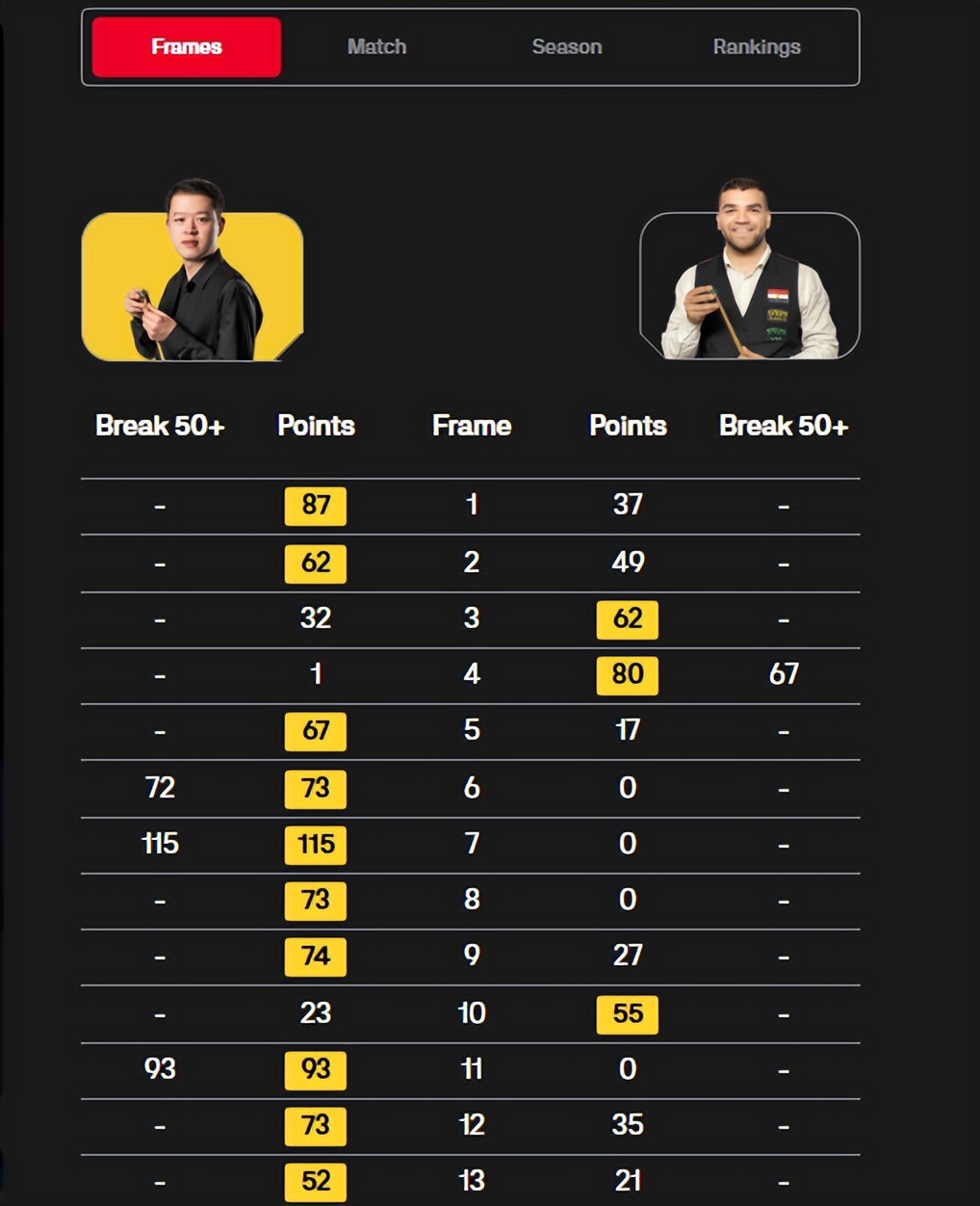 这样的比分优势,让赵瀚洋已经拿到八九成希望,正常发挥晋级无忧。今天凌晨2:00开始的的第二阶段,赵瀚洋继续强势发力,他又打出一波3-1攻势,总比分10-3将将马哈茂德-埃尔-哈雷迪淘汰出局。