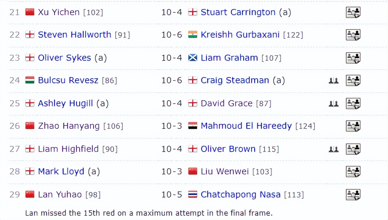 另一场资格赛第一轮的比赛中,17岁小将蓝裕豪迎战泰国选手恰查蓬-纳萨。这场比赛第一阶段,蓝裕豪表现极其霸气,取得8-1的领先优势。第二阶段,面对恰查蓬-纳萨的顽强反击,蓝裕豪顶住压力,总比分10-5战胜对手。至此,赵瀚洋、蓝裕豪携手晋级,祝贺他们!