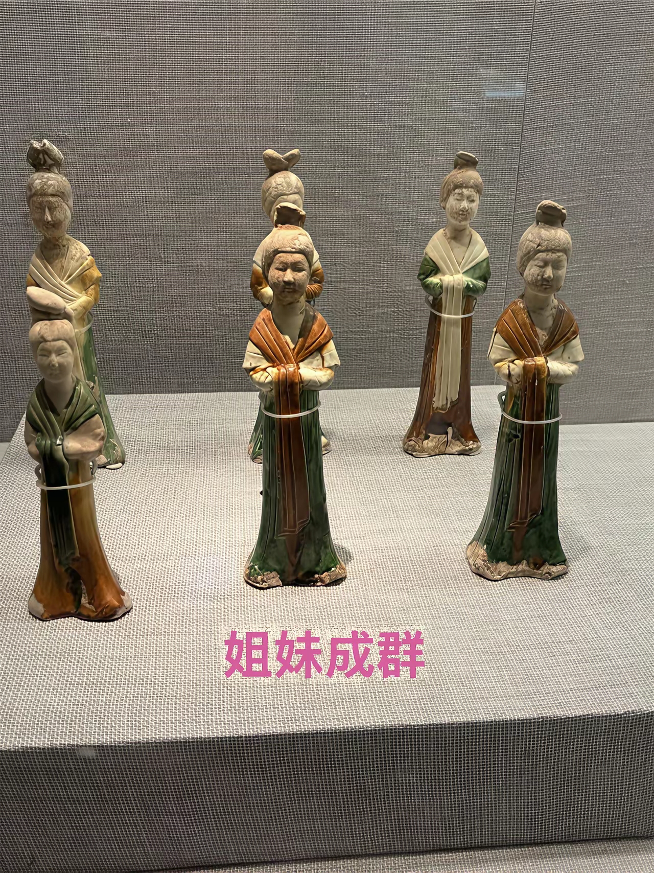 要说嗓门最大的“显眼包”,非北魏彩绘陶牵手女俑莫属。这对1500年前的“姐妹花”,头梳双髻,脸颊还留着俏皮的腮红,穿着同款宽袖长裙,双手紧紧牵在一起。她们昂首挺胸的姿态,像极了现代街头相约逛街的闺蜜,被网友戏称为“小手一牵,闺蜜千年”。在严肃的墓葬明器序列中,这种亲密无间的肢体语言极为罕见,她们不仅是北魏民族融合的见证,更是穿越时空的情感符号,引得无数游客穿着汉服模仿打卡。