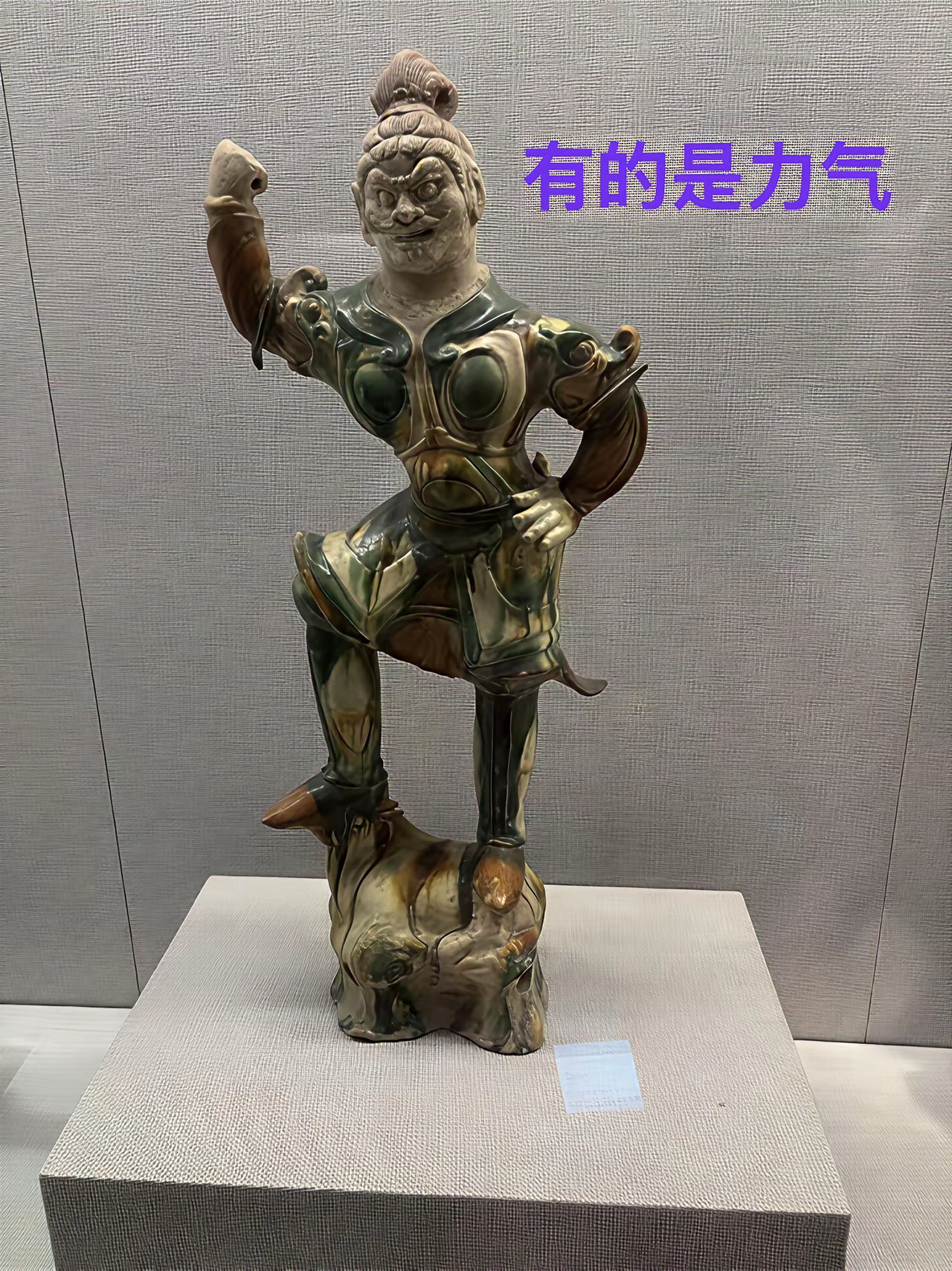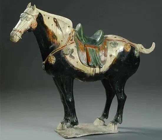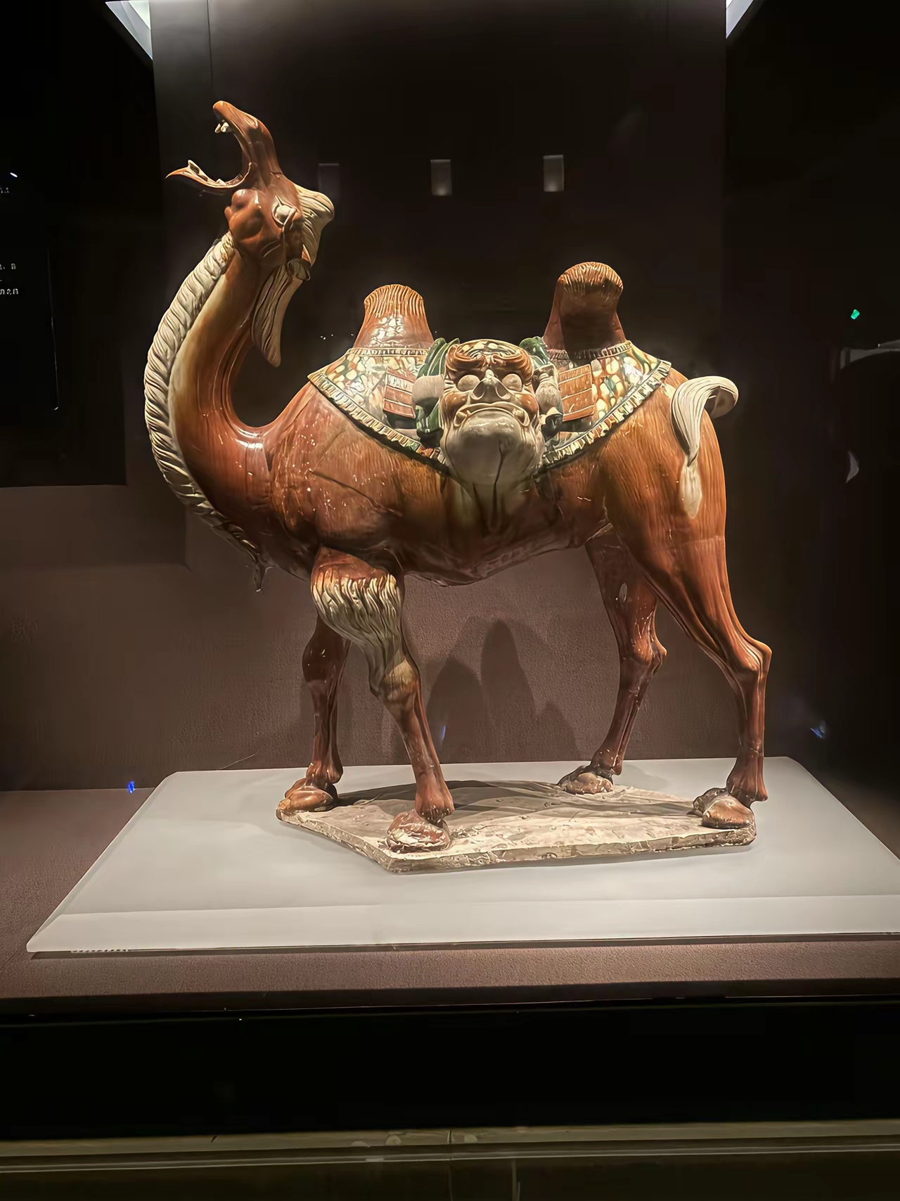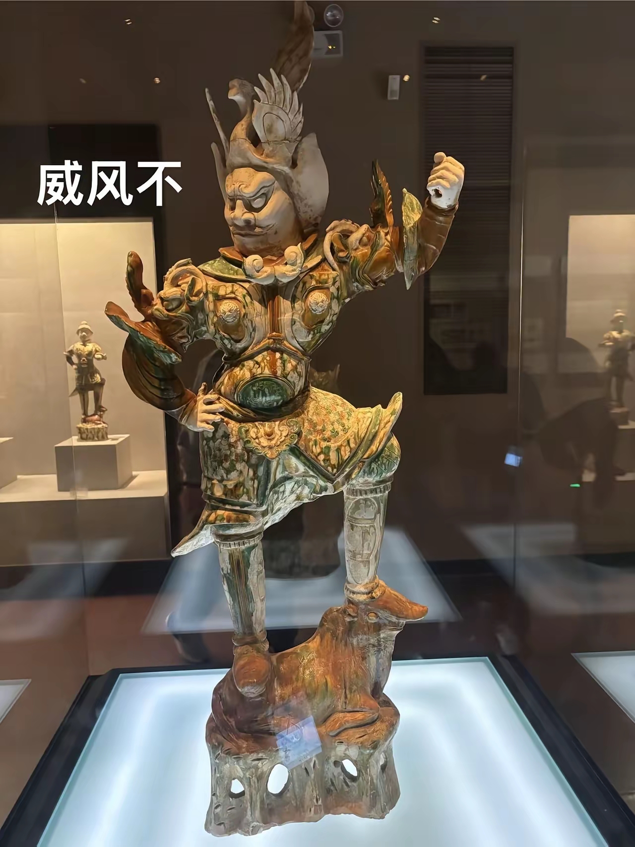 除了人物,动物俑也是“显眼包”大户。三彩黑釉马堪称“马中贵族”,通体乌黑,唯面、蹄如雪,这种罕见的釉色工艺让它自带高冷气场,是安菩夫妇墓出土的镇馆之宝。而面目狰狞的镇墓兽,虽然造型恐怖,但在当代审美下,反而因夸张的兽面和翅膀,被年轻人视为驱邪避凶的“硬核”萌物,默默守护着千年的安宁。