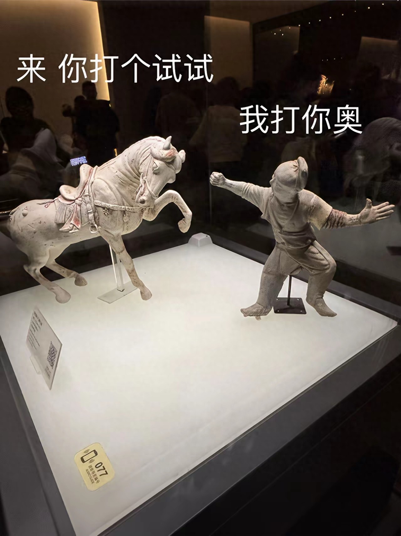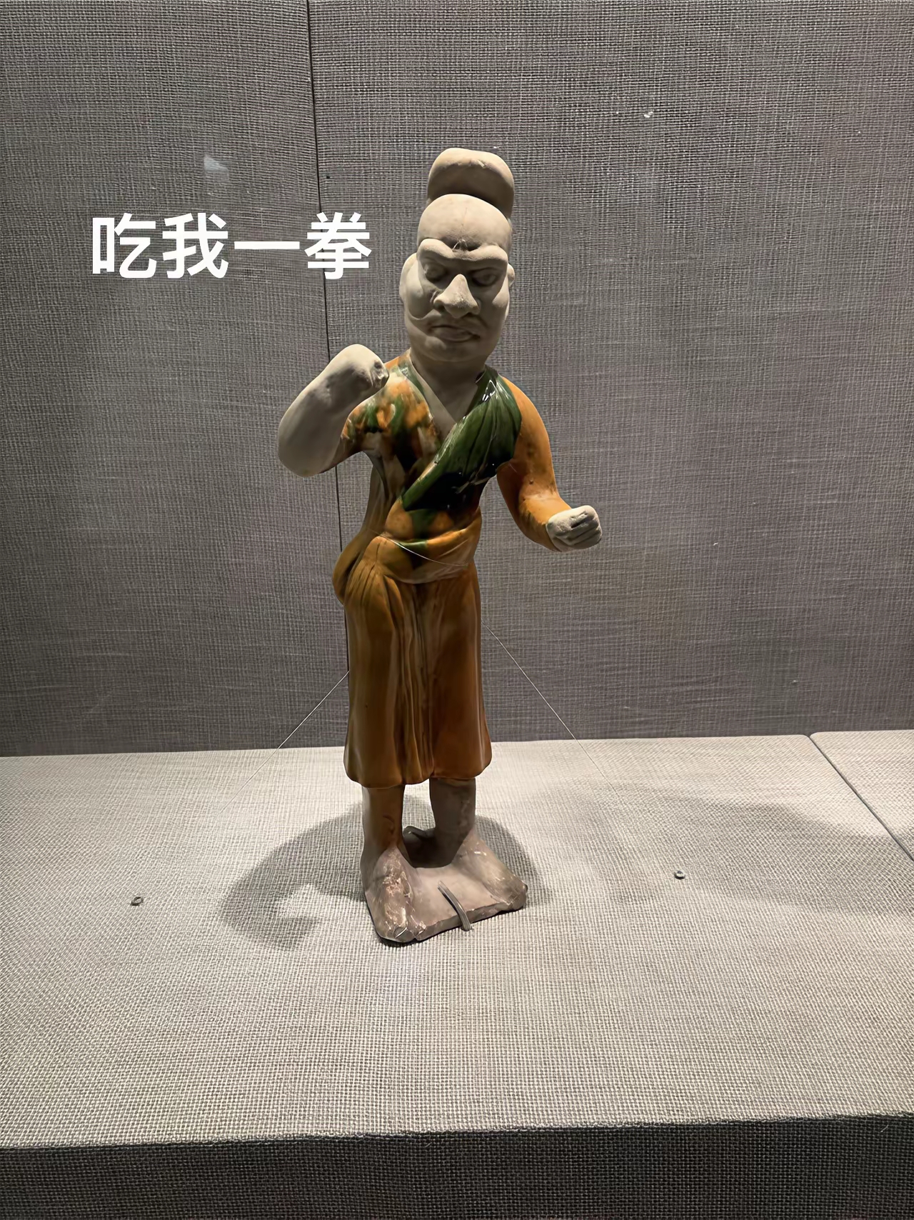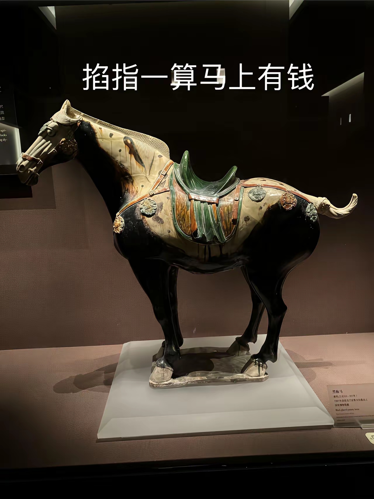 除了人物,动物俑也是“显眼包”大户。三彩黑釉马堪称“马中贵族”,通体乌黑,唯面、蹄如雪,这种罕见的釉色工艺让它自带高冷气场,是安菩夫妇墓出土的镇馆之宝。而面目狰狞的镇墓兽,虽然造型恐怖,但在当代审美下,反而因夸张的兽面和翅膀,被年轻人视为驱邪避凶的“硬核”萌物,默默守护着千年的安宁。