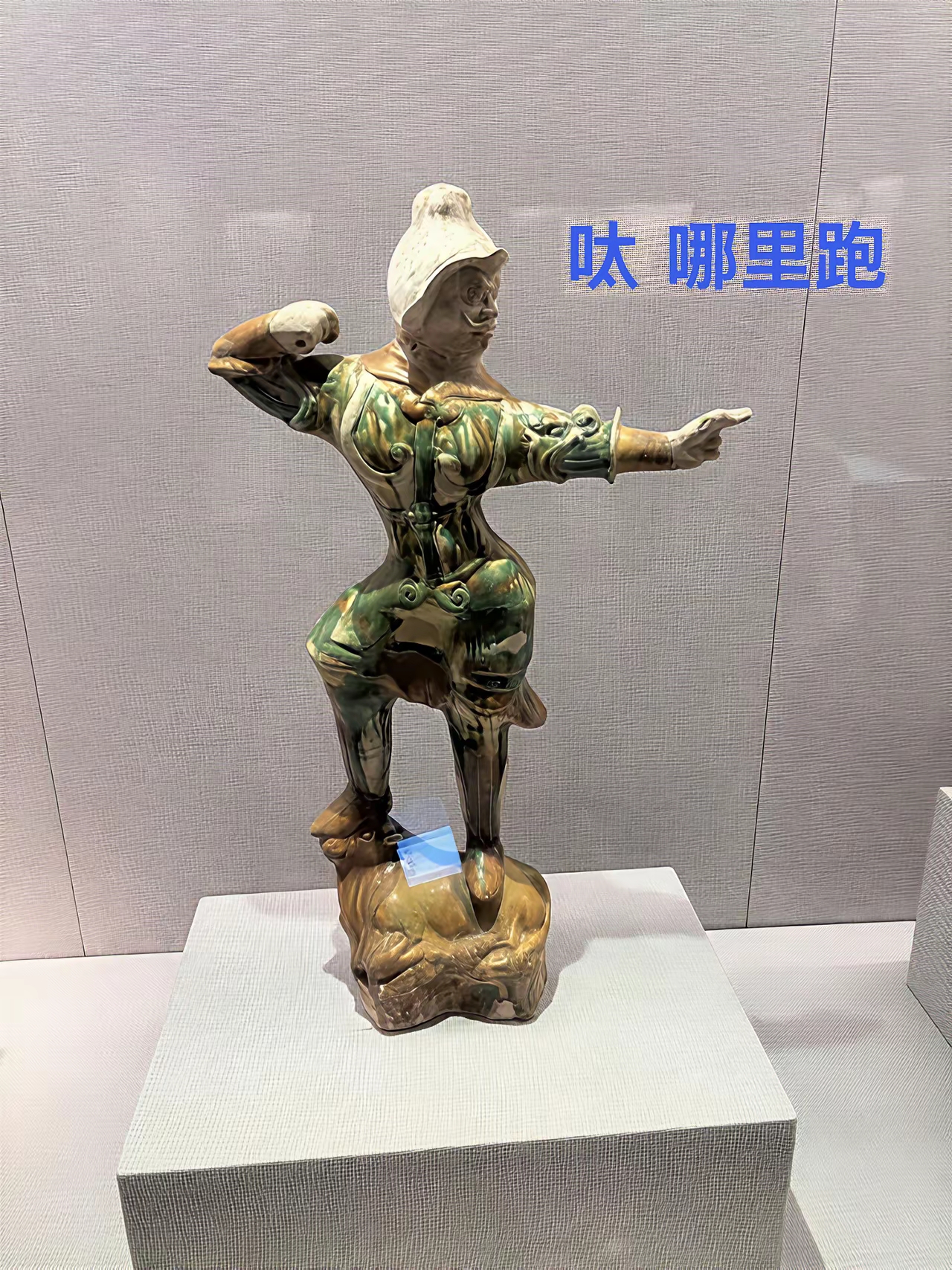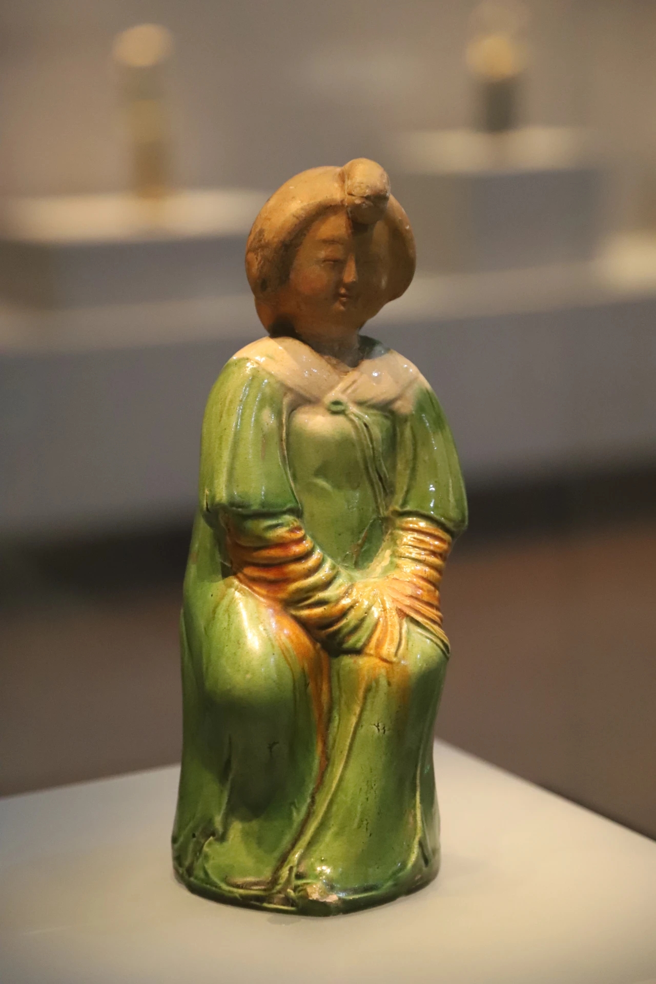 唐代的陶俑则是一部生动的 社会纪录片。三彩女坐俑体态丰腴,梳着高髻,悠闲地坐在墩座上,眉眼间透出盛唐女性的自信与安逸,仿佛在说“本宫今日妆容甚好”。与之形成反差的是成群结队的文吏俑与胡人俑:文官们峨冠博带,却面露谨慎,像极了在朝堂小心翼翼的中年“社畜”;深目高鼻的胡人牵驼俑,则定格了丝路商旅的艰辛,他们背着行囊,是洛阳作为国际大都市的鲜活记忆。