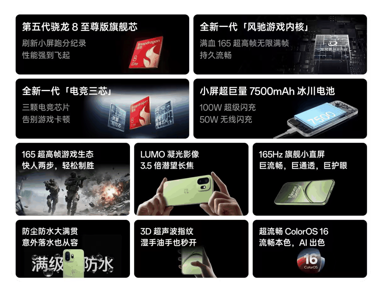 随着发布日期的临近,一加15T的配置信息基本上都曝光了,骁龙8E5处理器,风驰游戏内核6.32英寸1.5K直屏,165Hz刷新率,1.1mm极窄四等边,7500mAh大电池,潜望长焦,无线充电、超声波指纹、满级防水全部补齐。