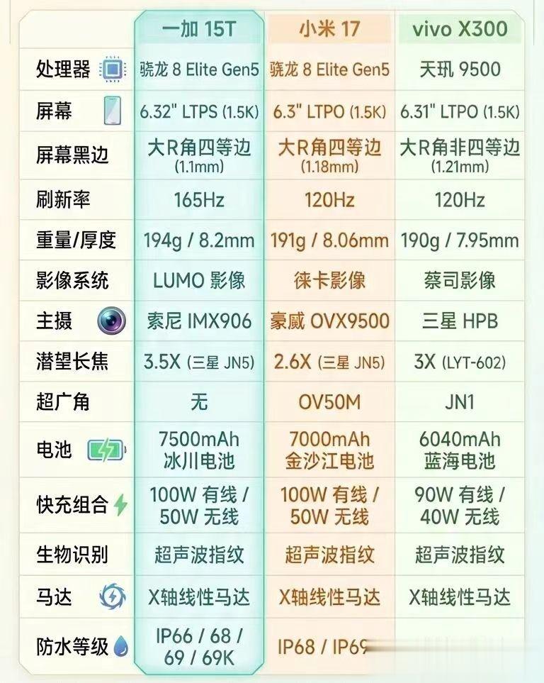 vivo X300明显更偏影像,2亿像素三星 HPB主摄、50MP超广、50MP的中底潜望长焦,这套影像搭配明显强于小米17和一加15T,但6040mAh电池算个槽点,这套打法更吸引更高影像追求的用户,但会劝退续航党。