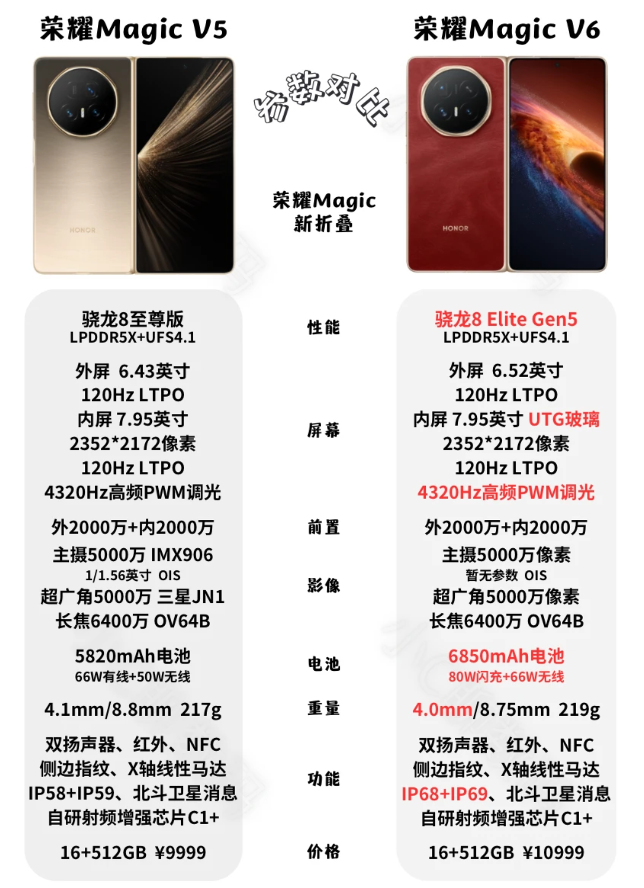先说价格,荣耀Magic V6相比上一代V5,价格还是8999起。就现在存储芯片暴涨的年代,能维持住原价必须点个赞。