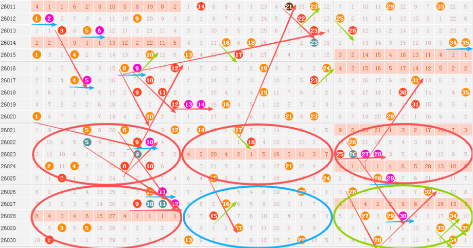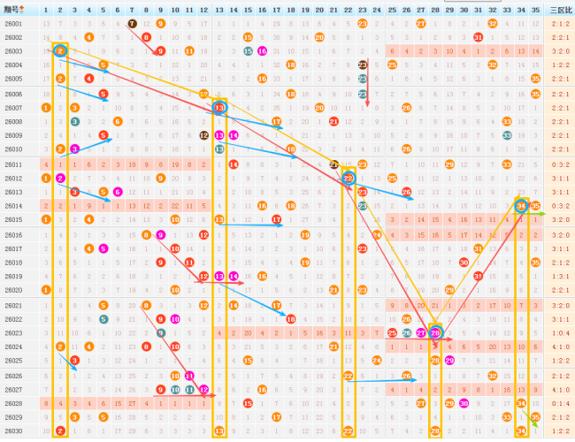 上期大乐透开出号码2、13、22、28、34。从三分区走势来分析,区间比呈现为1:2:2,大小比为3:2,奇偶比为1:4。