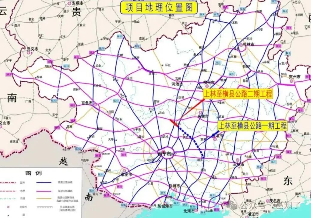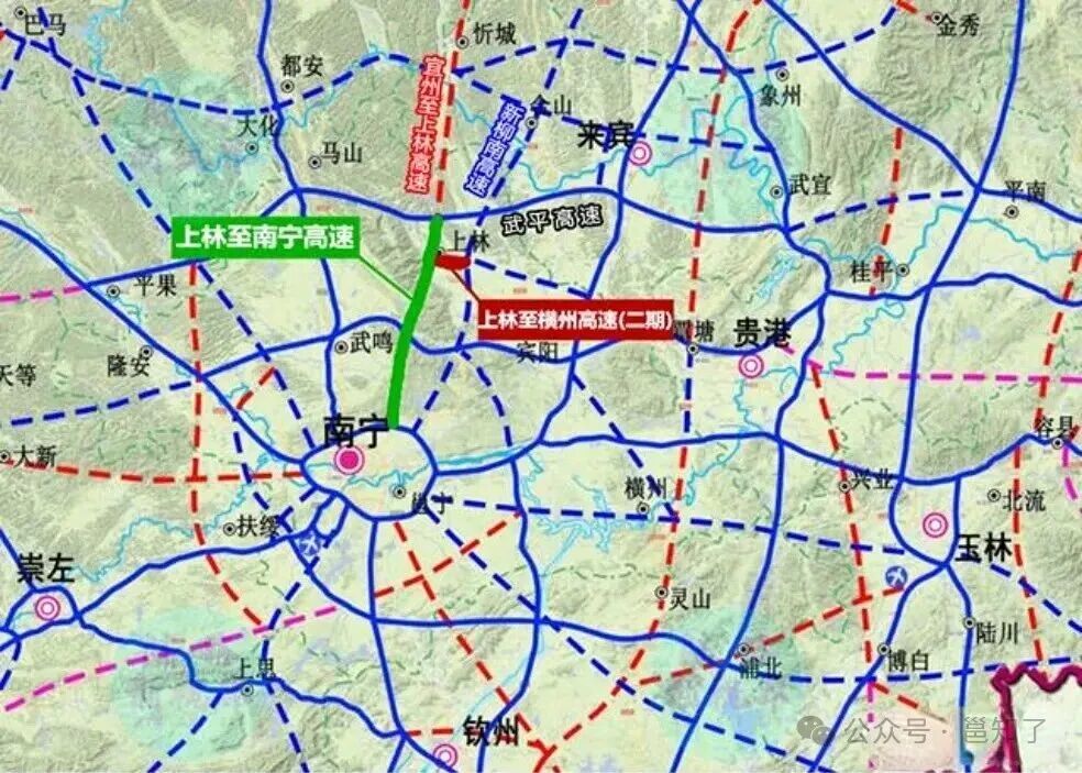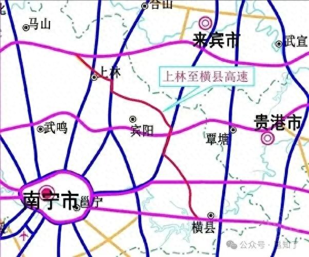 即路线:上林白圩镇(接三南高速)→宾阳→横州南乡镇(接深南高速)。惠及南宁周边三大市镇。