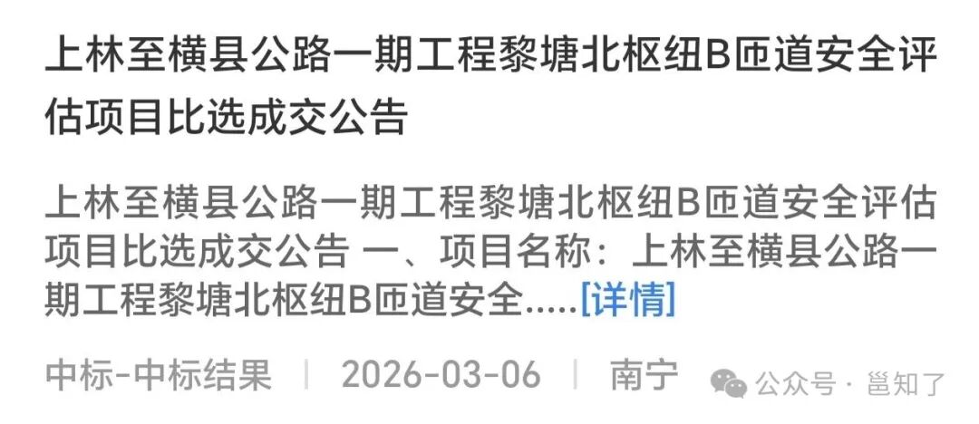 近日,3月6日,上林至横县公路一期工程黎塘北枢纽B匝道安全评估项目比选成交公告。