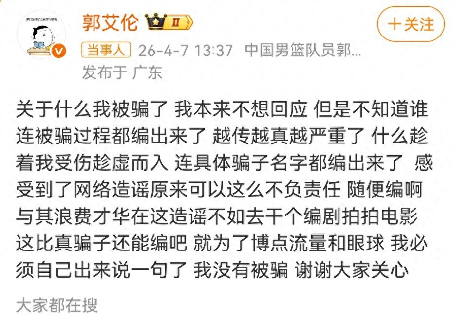 4月7号下午,郭艾伦本人直接在微博打脸: