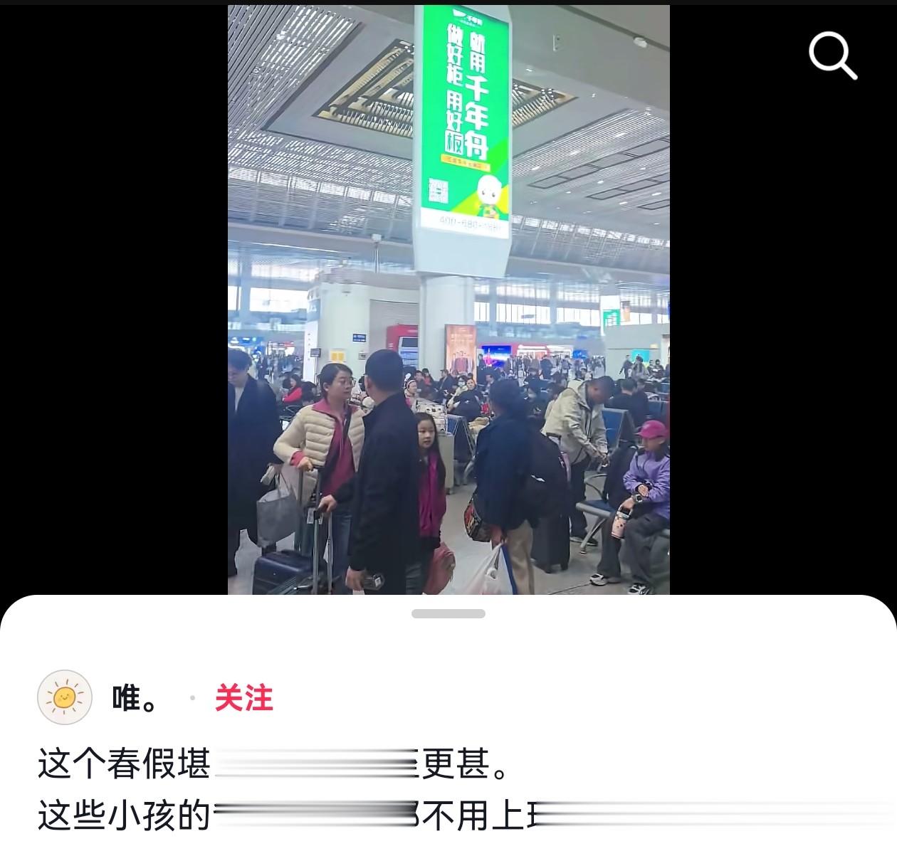 最近的机场、高铁站怕是要改名为“大型儿童春游现场”了!有网友拍下了景区内、候机大厅里密密麻麻的人潮画面,配文调侃:“这个春假堪比春运,甚至更甚!这些小孩的爸爸妈妈们都不用上班吗?”
