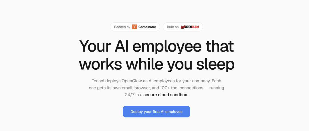 YC 26冬季班的Tensol,是这条路线里的代表之一。它直接把自己定义为基于OpenClaw打造的企业AI员工,核心思路并不复杂:把不同岗位的智能体放进隔离环境里,再接入企业日常会用到的Slack、HubSpot、GitHub等系统,让它们直接承担招聘、销售、运营、开发辅助等具体工作。某种程度上,这类产品卖的已经不是“一个好玩的开源框架”,而是“一个可以直接上岗的数字劳动力”。