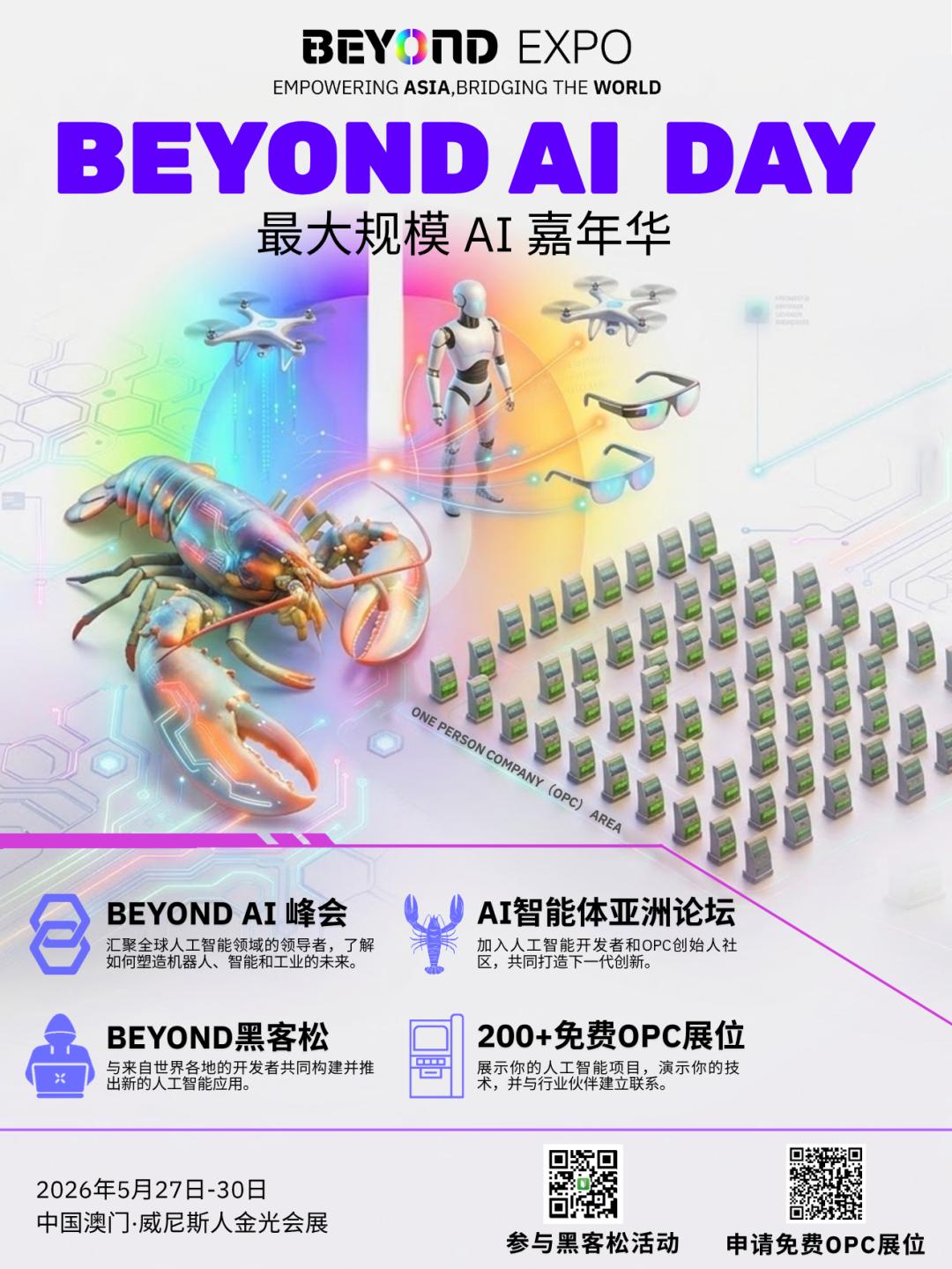 亚洲最大“养虾”局:BEYOND AI DAY登场!2026 年 5 月 30 日,BEYOND AI DAY 将在澳门威尼斯人金光会展震撼开启!这不仅是一场 AI 领域的年度盛会,更是一次属于全球开发者、创业者和科技领袖的集体狂欢! 从巅峰对话的行业趋势,到硬核烧脑的黑客松,再到链接全球资源的开发者社区,我们将用一天的时间,集中展示 AI 科技的最高频脉动。