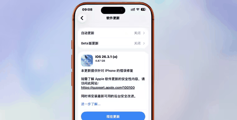 这版 iOS 26.3.1a 不加新功能,是个双效修复包,安全洞堵住,续航和发热也调顺,手里的手机正被这两件事困着,点一下下载并安装,这次升级划得来。