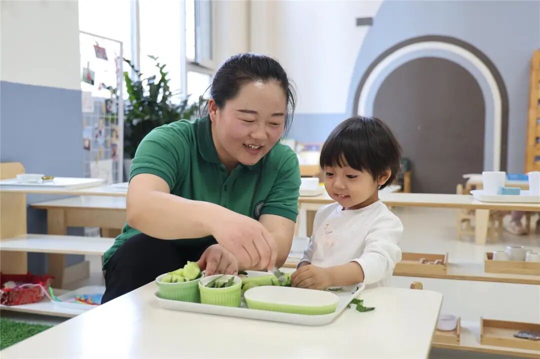 老师陪伴幼儿进行蔬菜料理实操。