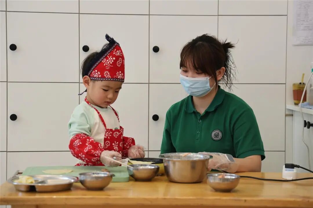 老师陪伴幼儿开展食育手工活动。