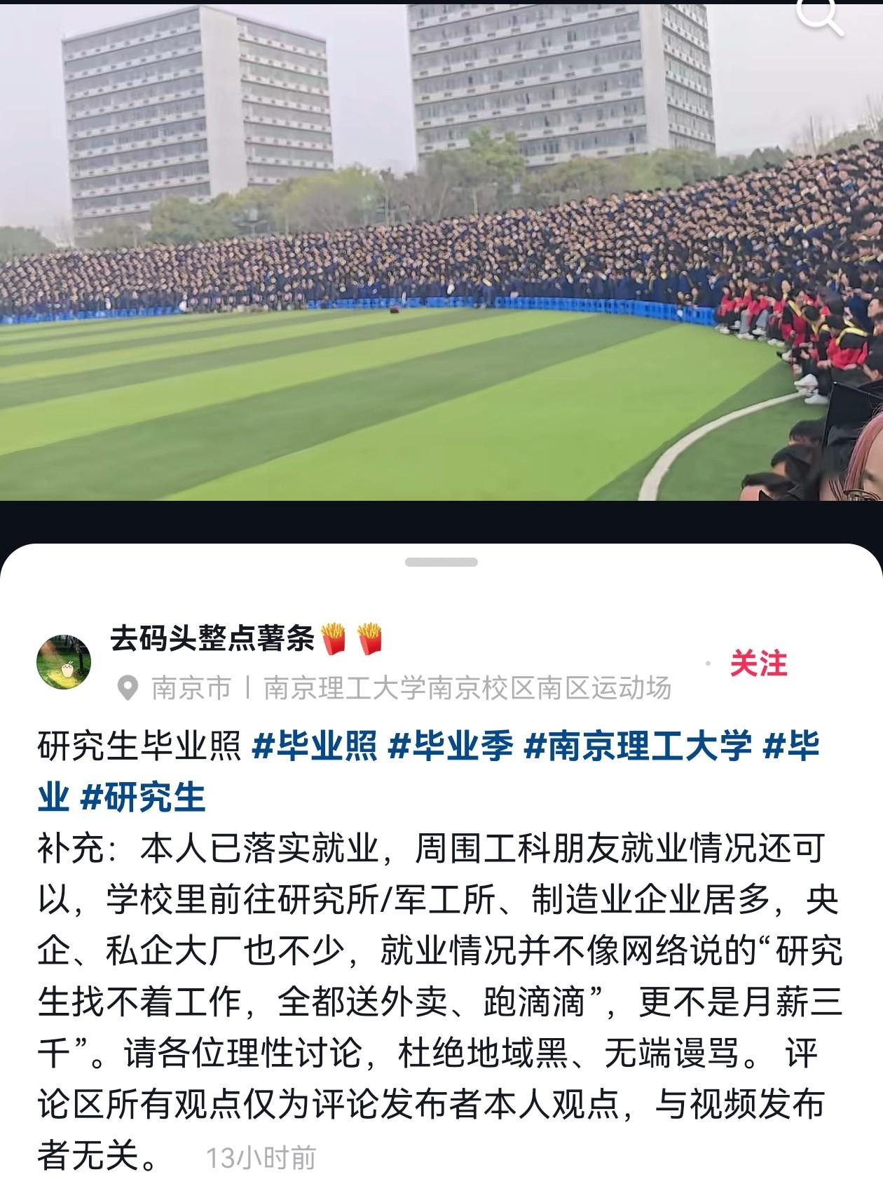 视频里,南理工南区运动场上乌泱泱坐满了人,放眼望去全是密密麻麻的脑袋,一眼望不到头的研究生方阵,直接把网友看傻了。有网友当场破防:“这么多研究生,毕业不就等于失业?怕不是毕业就要去送外卖、跑滴滴?”
