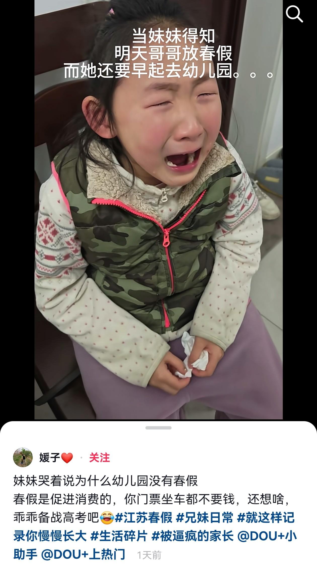 画面里,江苏一位扎着小辫子的小妹妹,一听到哥哥明天就要放春假可以出门撒欢,瞬间开启“暴风哭泣”模式。她一边哭一边委屈巴巴地念叨,满脸都是不服气,那撕心裂肺的模样,仿佛整个世界都只剩下“我没有春假”这一件伤心事。
