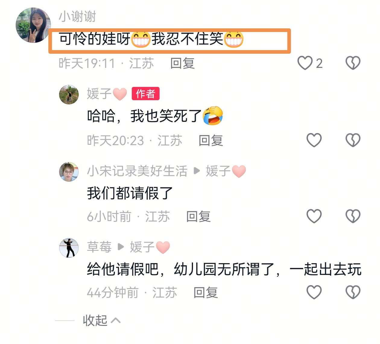 这一幕可把网友们乐坏了,纷纷留言笑称“精准戳中当代小朋友的痛点”。有的家长感同身受:“我家娃也是,一听说能出去玩,那情绪转换比翻书还快,哭着喊着也要幼儿园放春假!”还有网友调侃:“春假表示:这锅我不背,是哥哥的快乐太刺眼了!”