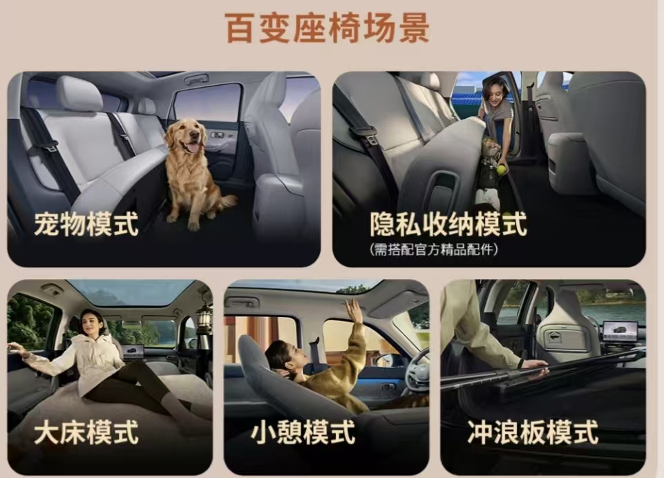 更贴心的是百变座椅场景:二排座椅坐垫支持Z大60°的上翻,带毛孩子出门?一键切换「宠物模式」,给TA专属小天地;想露营躺平?「大床模式」秒变移动卧室;临时补觉、收纳隐私、甚至放冲浪板……「小憩/隐私收纳/冲浪板模式」,一辆车,承包你所有生活方式。从日常通勤到周末撒野,从家庭出行到宠物陪伴,零跑用空间魔法,让每段旅程都“刚刚好”。