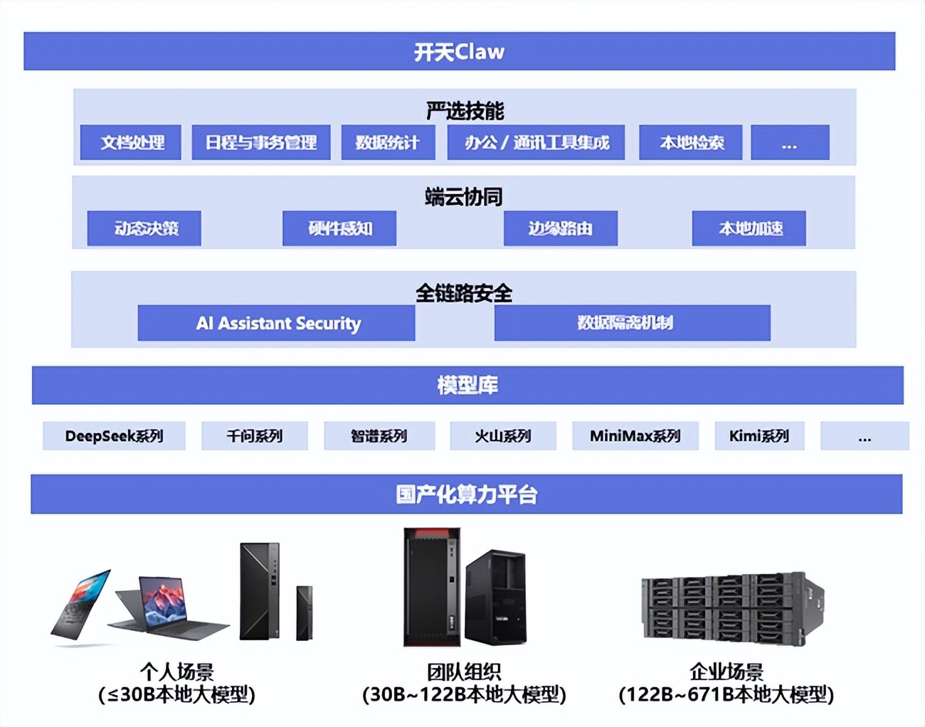 面向更广阔的应用场景,联想开天还倾力打造了"开天Claw"全家桶能力,以阶梯式的国产化算力底座满足不同规模的落地需求。方案以"开箱即用、端云协同、技能预置、全链路安全"为核心价值,覆盖“个人、团队、企业”三大场景。