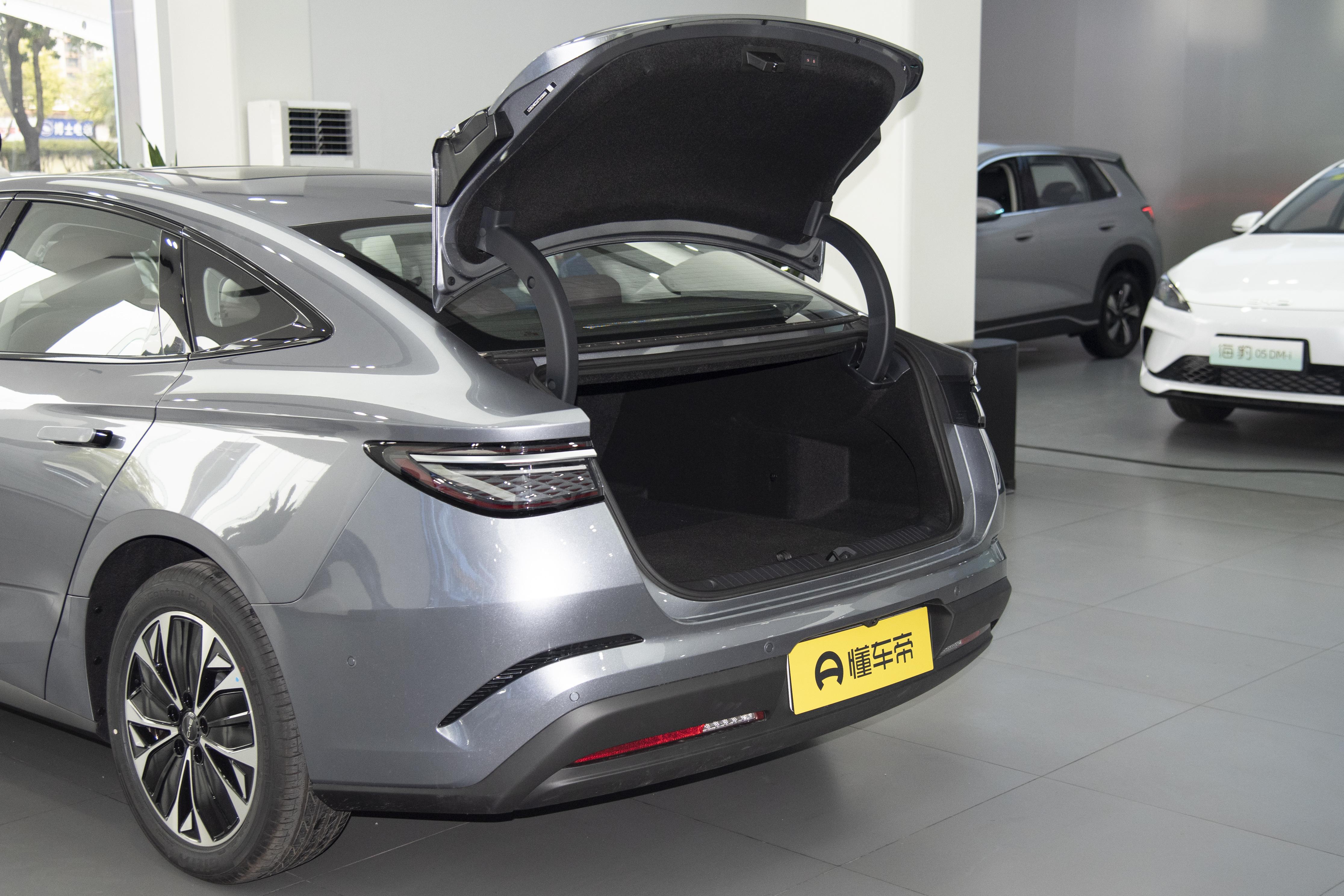 车尾部分的设计风格和前脸保持一致,简洁大方。贯穿式的尾灯组是车尾更引人注目的元素,它横向布置,有效拉伸了车尾的视觉宽度。尾灯内部采用了点阵式排列的 LED 光源,在夜间点亮后辨识度超高,就像夜空中的星星一样闪耀。尾灯上沿装饰有镀铬条,尾标更换为可发光的“BYD”标识,让车尾看起来更时尚。后包围的造型简洁,两侧设有导流口,既美观又实用。