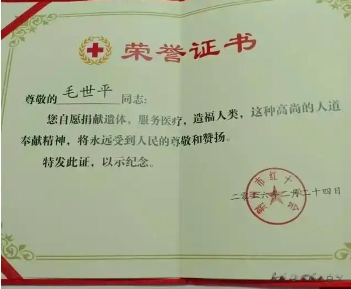 2026年3月20日,恰逢毛世平老人的“五七”祭日,女儿毛女士沉浸在思念中难以平复,随手在社交平台发布了一条简短的动态,配上父亲生前照片与遗体捐献荣誉证书,写下了那句戳中无数人的话: