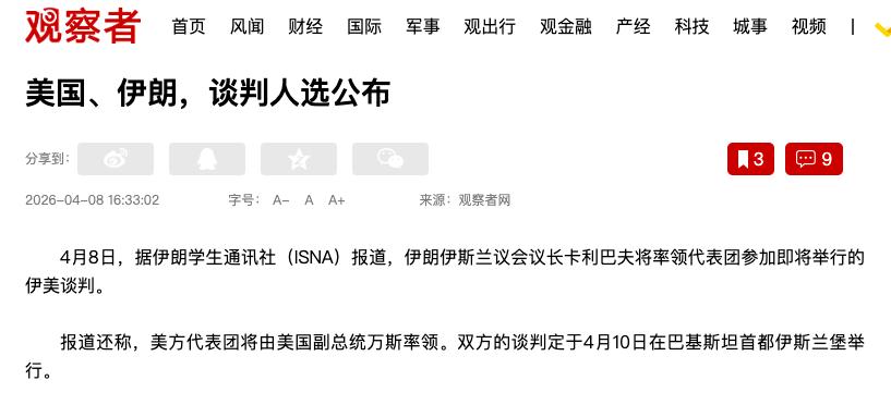 美国谈判名单出炉,副总统扛大梁停火协议生效后,谈判的大幕随即拉开。4月8日,伊朗学生通讯社(ISNA)报道确认,伊朗伊斯兰议会议长卡利巴夫将率领代表团参加谈判,而美方代表团的领队则是美国副总统万斯,双方谈判定于4月10日在巴基斯坦首都举行。