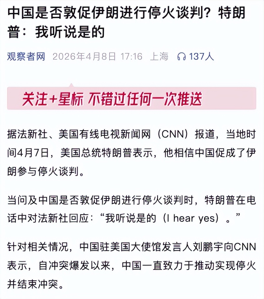 美联社的消息则进一步佐证,一位参与斡旋国家的官员明确表示,在“最后期限”逼近的生死时刻,中方和美国副总统万斯分别发挥了促成作用,尤其是中方成功说服伊朗方面同意停火。