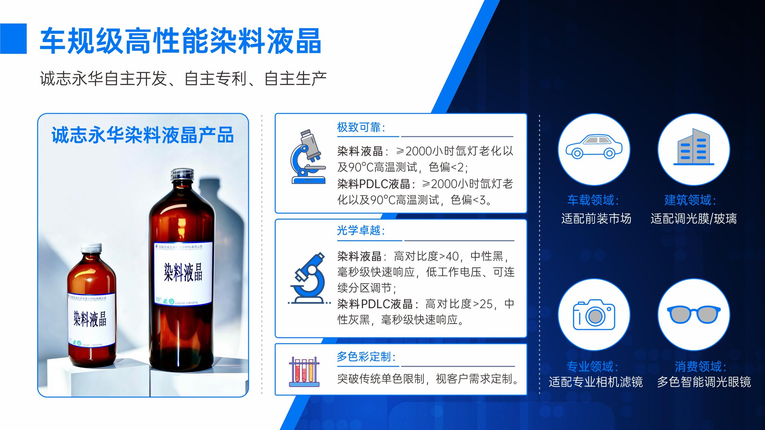 新能源车对隐私、氛围、轻量化、智能化的需求,直接带动全面电控调光化。诚志永华车载染料液晶通过严苛车规验证,可批量应用于后排侧窗、车顶天幕等部位。