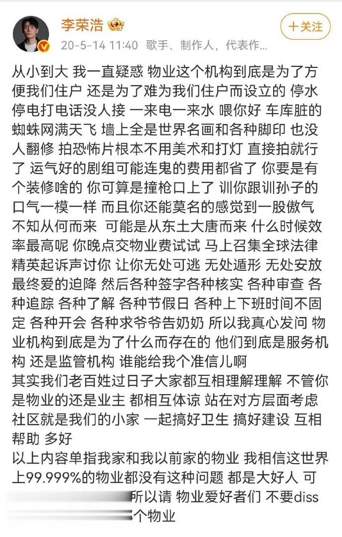 2020年5月14日,李荣浩在微博发布了一篇吐槽自家物业的文章,这篇文章是他的吐槽生涯的巅峰之作。