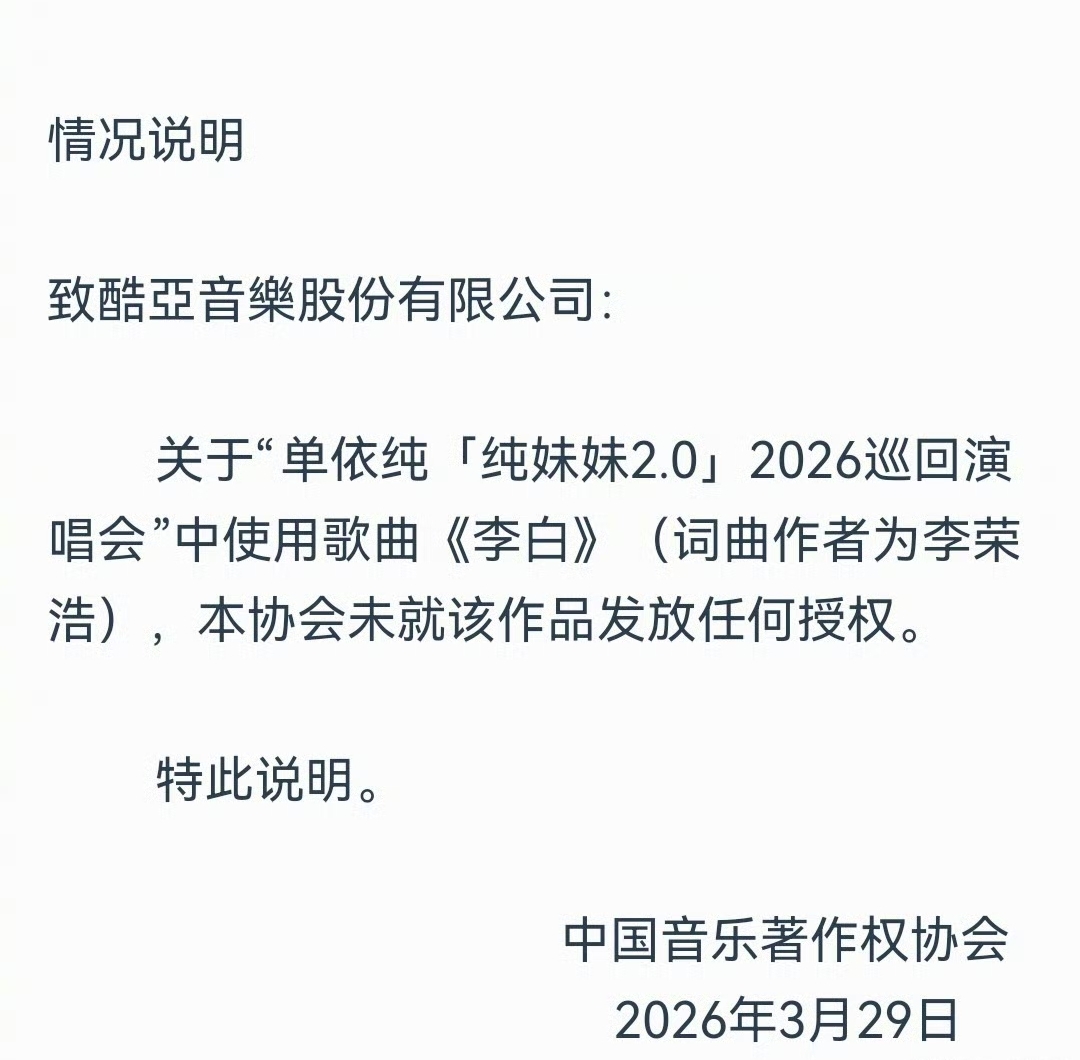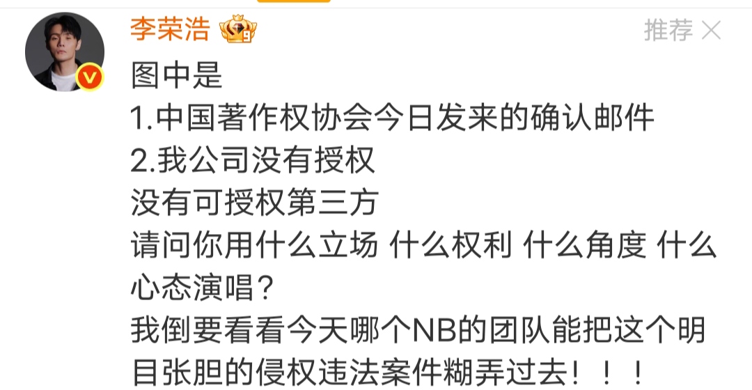 当单依纯团队在未获授权的情况下执意演唱《李白》,李荣浩第一时间晒出中国音乐著作权协会的未授权证明,用法律条文和事实精准反击。