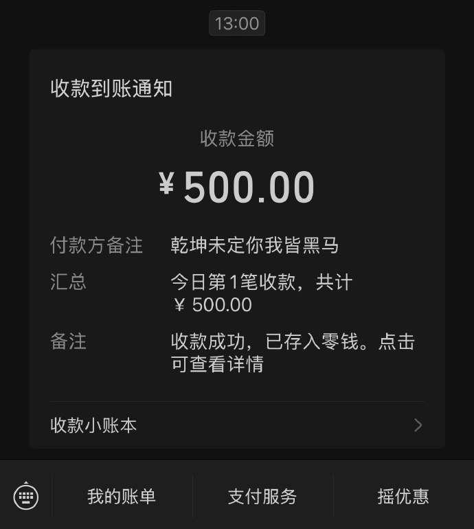 这位幸运的女粉丝还晒出了当天的收款记录,截图显示:收款金额为500元整,到账时间为演唱会当日,付款备注为巡演主题语“乾坤未定你我皆黑马”。