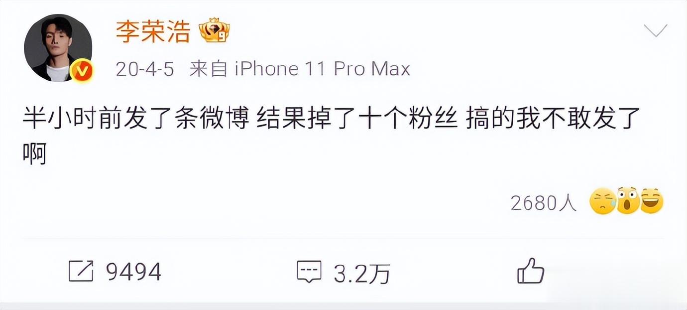 2020年李荣浩在微博晒出自拍并配文“是不是想哥了”,半小时后发现粉丝数减少10人,随即发文感慨:“半小时前发了条微博,结果掉了十个粉丝,搞的我不敢发了啊”。