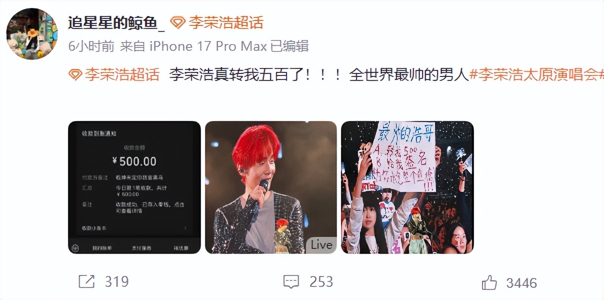 演唱会结束后,女粉丝在微博上发文:李荣浩真转我五百了!全世界最帅的男人。