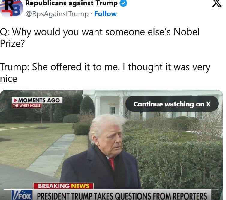 当美国总统特朗普从委内瑞拉反对派领导人玛丽亚·科琳娜·马查多手里接过她的诺贝尔和平奖时,有记者问了一个尖锐的问题: